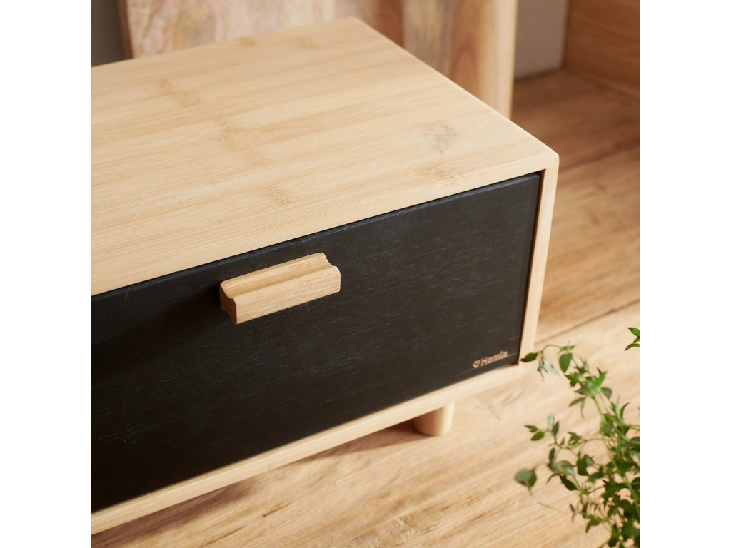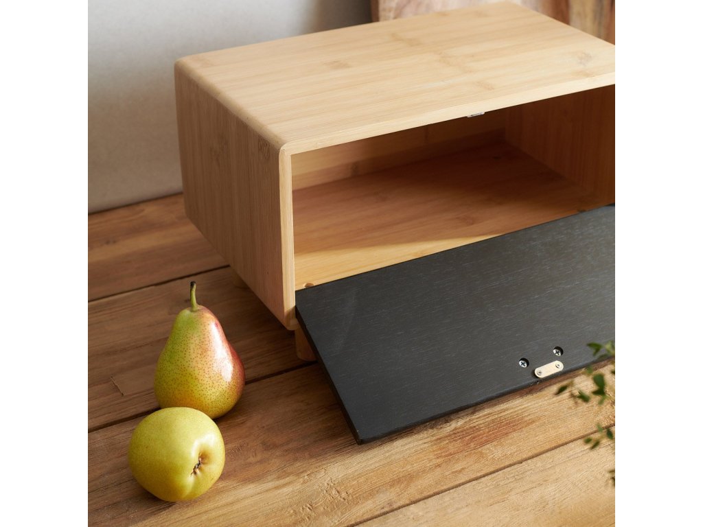 Chlebník BAMBOU má tvar krychle, jejíž přední část se otevírá. Je připevněn na pantech. Je natřena černou barvou a na její horní části je připevněna podlouhlá rukojeť. Ostatní části jsou v barvě přírodního dřeva. Celkové rozměry jsou 35x24 cm. Deska je vyrobena výhradně z bambusového dřeva.