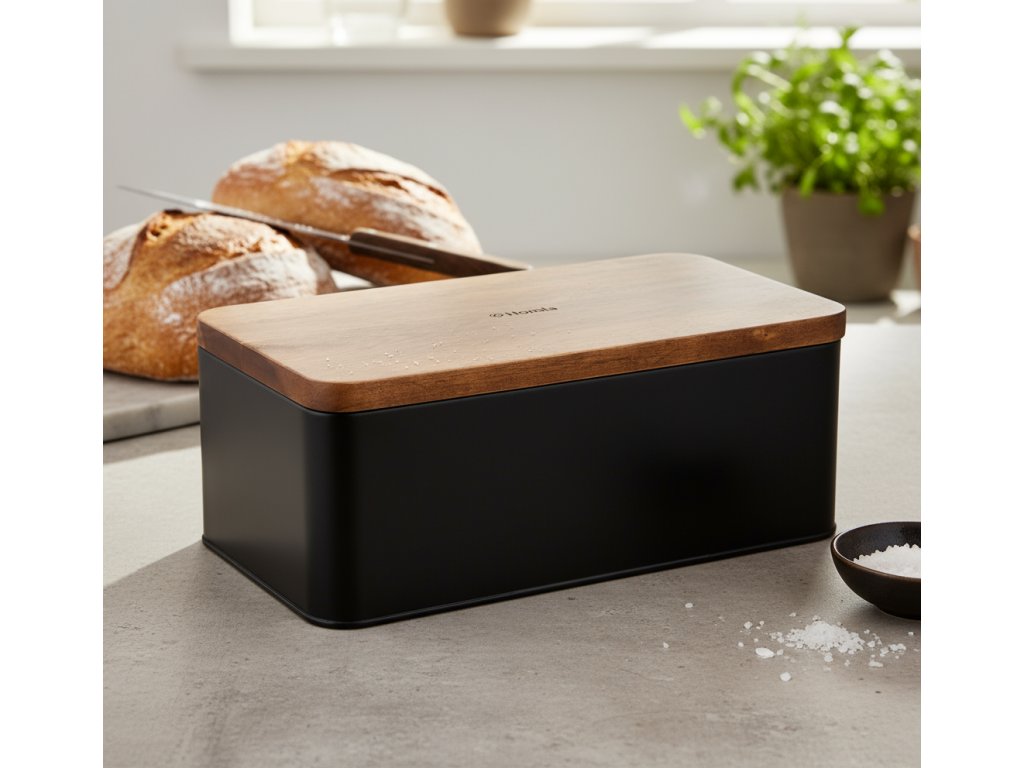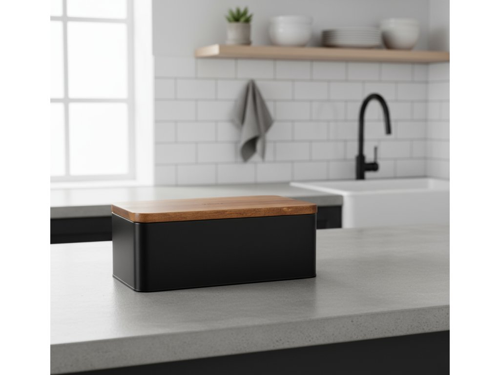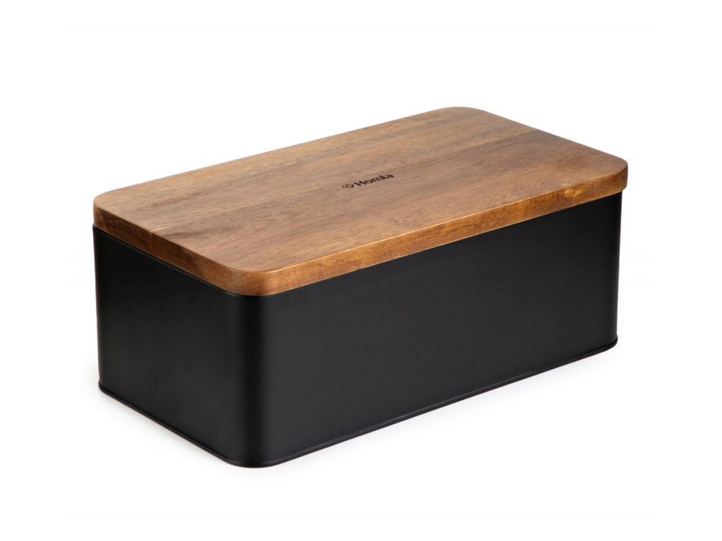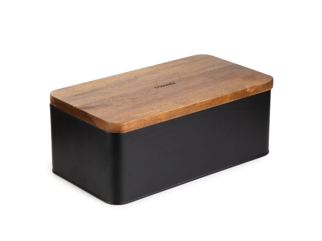 Udržuje chléb déle čerstvý - Výklopné víko z akáciového dřeva - Stylový, minimalistický design - Snadno se udržuje v čistotě - Černý chlebník s dřevěným víkem