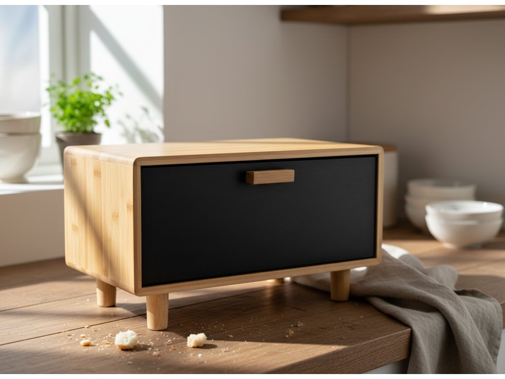 Chlebník má velmi promyšlený design. Má otevírací dvířka, takže obsah není vidět. V zadní části jsou vyříznuty otvory, které zajišťují větrání, chléb zůstává déle čerstvý a pomaleji se kazí. Protože je postaven na nožičce, je velmi snadné udržovat jeho okolí v čistotě, což je na kuchyňské lince, kde se připravují pokrmy, nesmírně důležité.