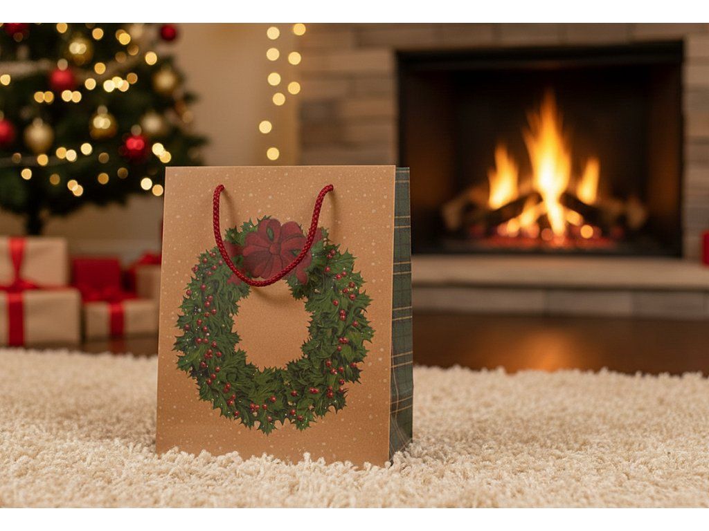 Dárková taška má hřejivé, sváteční barevné provedení. Na hnědém pozadí je grafika znázorňující vánoční věnec ze zelených větví, zdobený bordó mašlí. Kolem něj jsou bílé tečky připomínající padající sníh. Boky tašky jsou zdobeny zeleným kostkovaným vzorem. Taška je opatřena kaštanovými provázky, které slouží jako ucha.