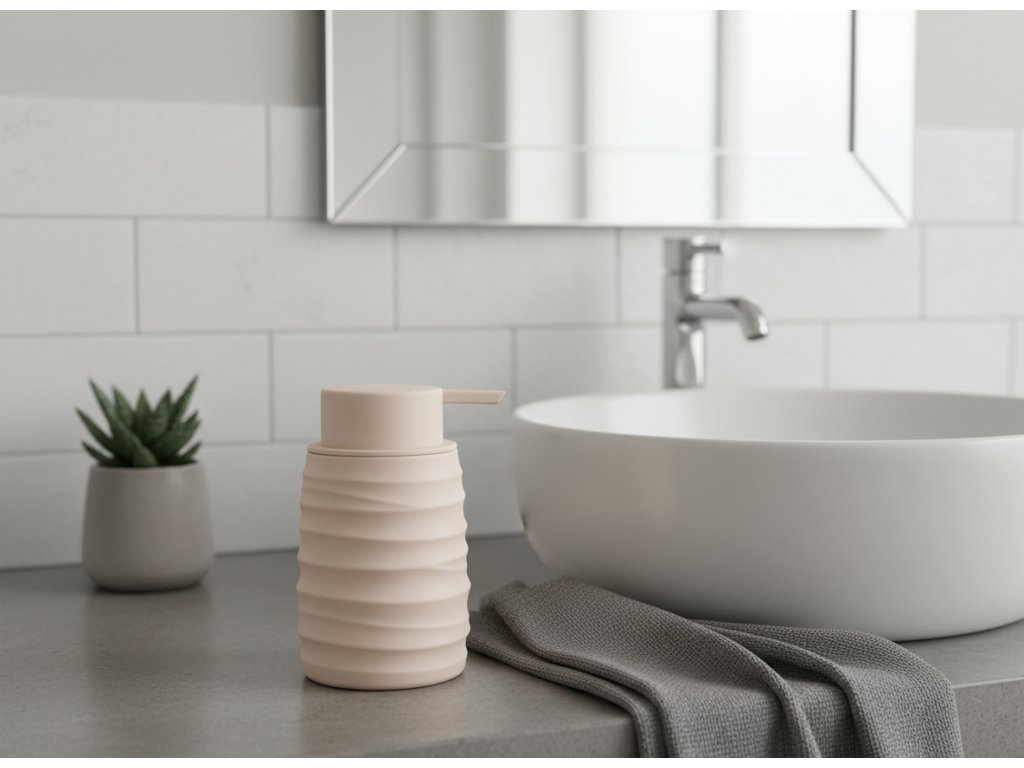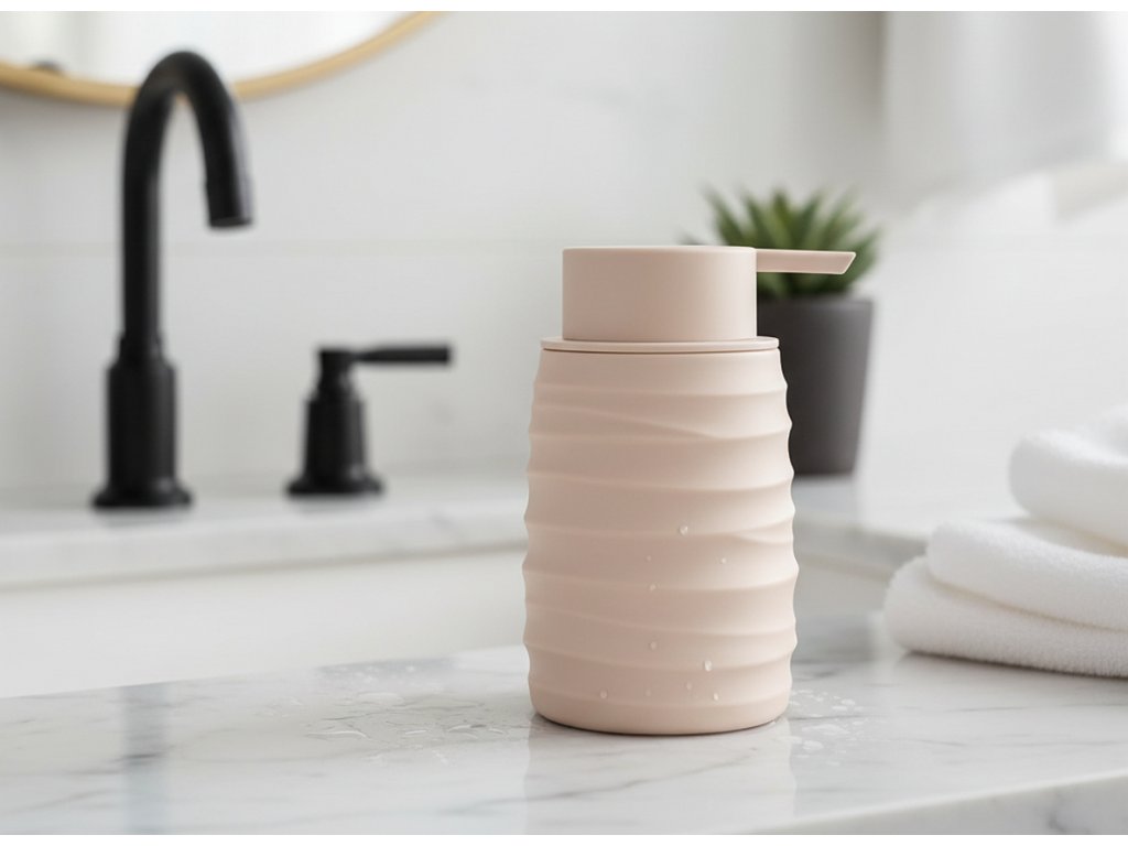 Moderní design v módní béžové barvě - S jemným reliéfem na povrchu - Kompaktní a praktický - Ideální pro tekuté mýdlo, tělové mléko nebo jiné kosmetické přípravky