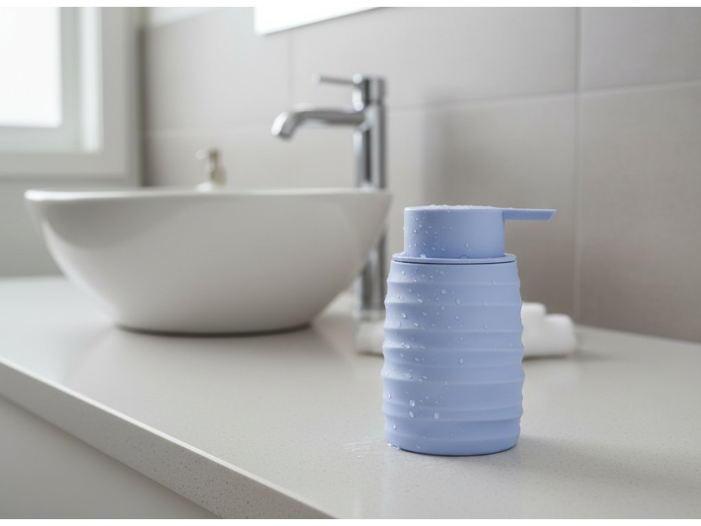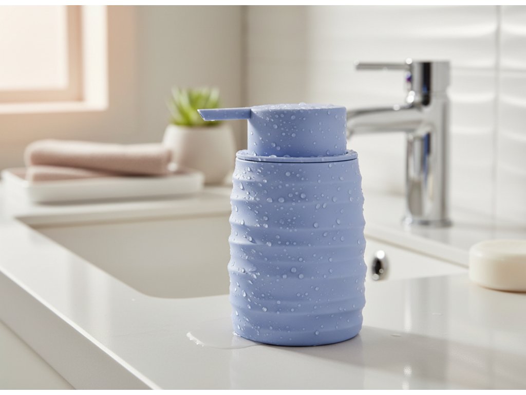 Dávkovač má minimalistický tvar, který zaujme svými detaily. Světle modrá barva a jemné horizontální reliéfy mu dodávají moderní a svěží charakter. Snadno se hodí do módních koupelen, ať už ve skandinávském nebo moderním stylu.