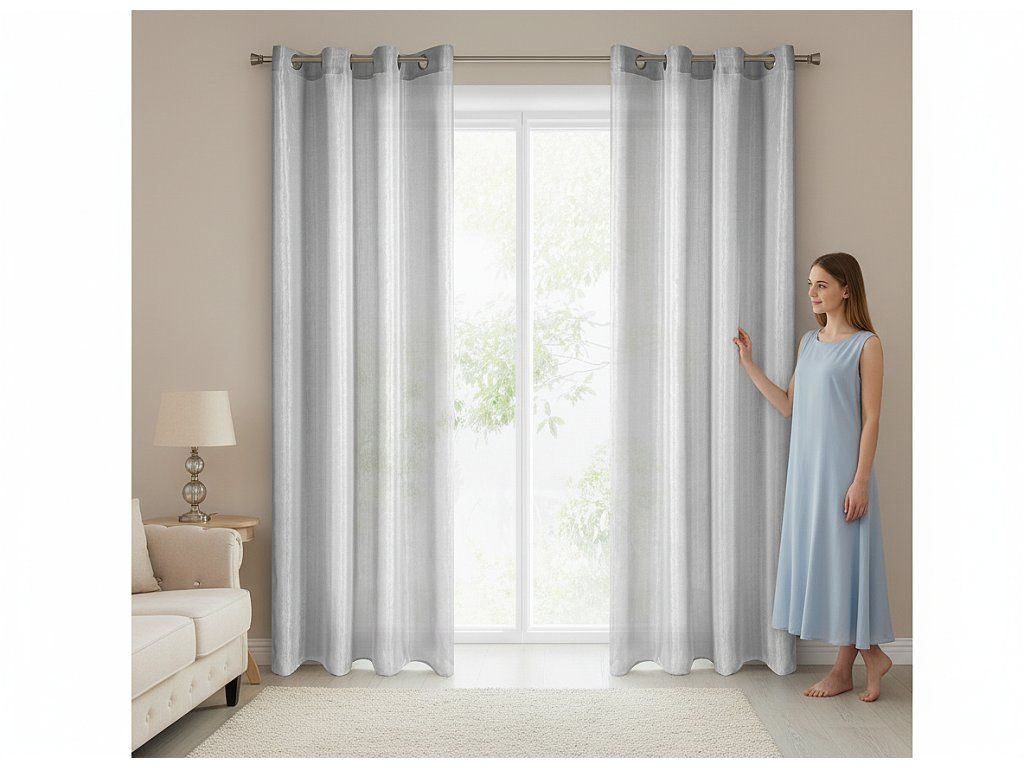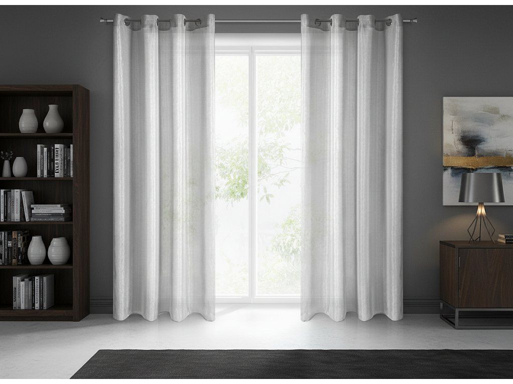 hotová dekorační záclona vyrobená ve vysoké jakosti v moderním a trendovém provedení do ložnice nebo obývacího pokoje o rozměru 140x250 cm s kroužky pro tyčovou gárnyž. 1 kus v balení. Záclona je vyrobena v lesklém provedení. Záclona je vyrobená z hustě tkaného etamínu s přídavkem lesklé stříbrné nitě, díky níž se její povrch atraktivně leskne. Dekorace je určena do moderních interiérů, jejichž eleganci dokonale podtrhuje. Poloprůhledná struktura účinně ozdobí vaše okno, ochrání interiér před nadměrným slunečním zářením a zajistí příjemnou atmosféru v interiéru.