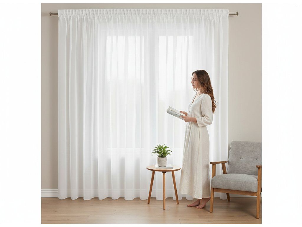 Hotová záclona v odstínu sněhově bílé, ušitá z hladké, lesklé mikrosíťoviny, je nadčasovým dekorativním prvkem každého interiéru. Dokonale se hodí k oknu ve vaší ložnici, jídelně nebo obývacím pokoji a dodá interiéru jedinečný charakter. Jemný a půvabný materiál krásně vypadá a po zavěšení vytváří měkké a pravidelné vlny. Nařasovací páska všitá v horní části záclony zajišťuje, že záclona po zavěšení vypadá rovnoměrně a elegantně. Taková dekorace se hodí do každého interiéru, ať už je zařízen v minimalistickém stylu, nebo v interiéru zařízeném s okázalostí a přepych. Výběr záclon k této zácloně nepředstavuje žádný problém, právě ony budou rozhodovat o celkovém stylovém pojetí. Skvěle se bude prezentovat i samostatně, bez doplňků.