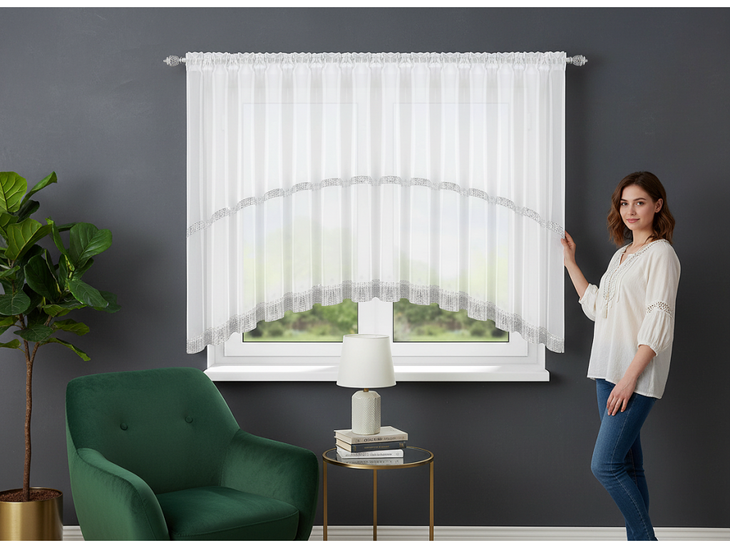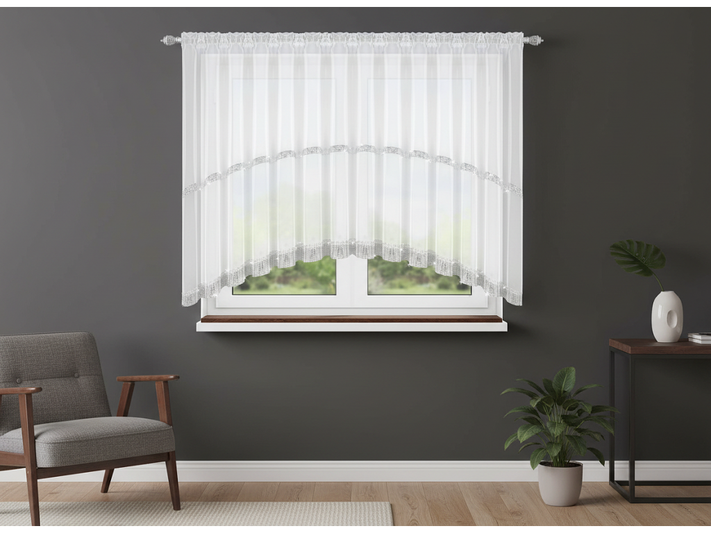 Krátká dekorativní záclona ušitá do oblouku z vysoce kvalitní hladké voálové tkaniny. V horní části je všitá řasicí páska s tunýlkem, která umožňuje upevnění na záclonovou tyč. Okraje jsou zakončeny řasením. Ve střední části i na konci je všitý zirkonový pásek, v horní části široký 3 cm a ve spodní části 6 cm.