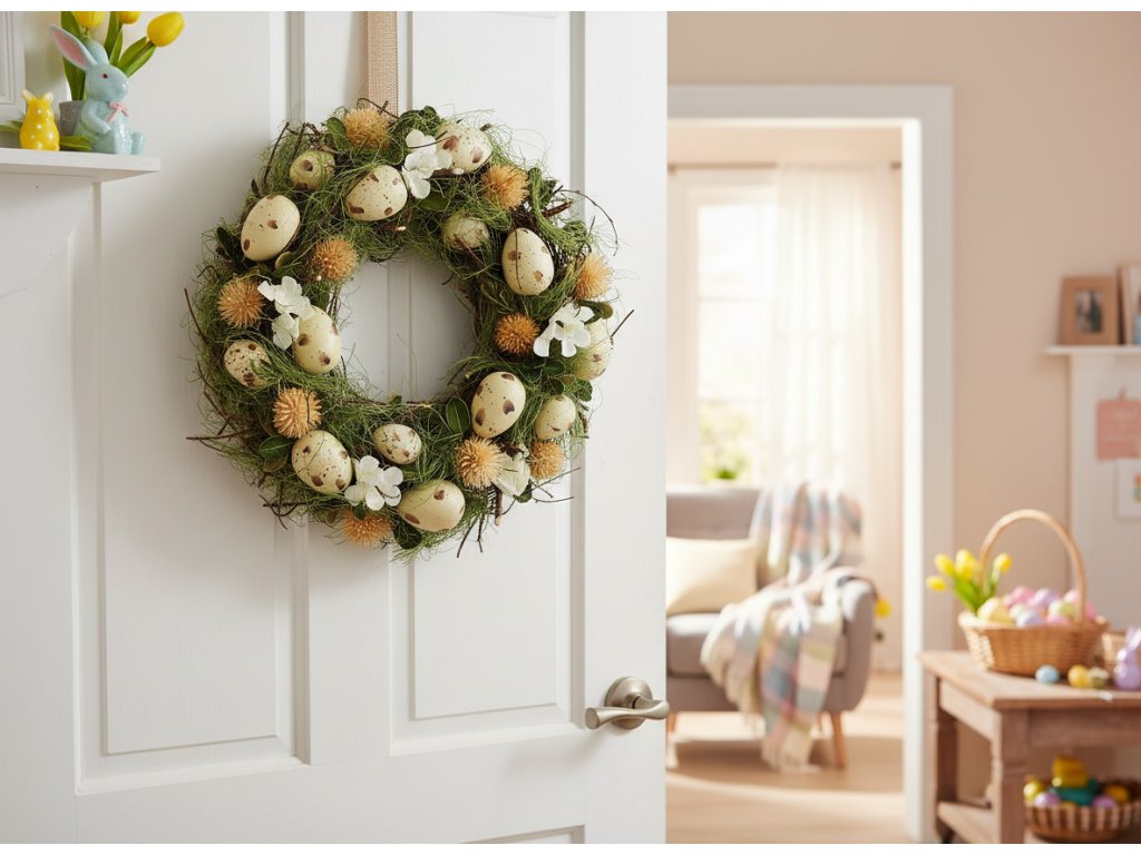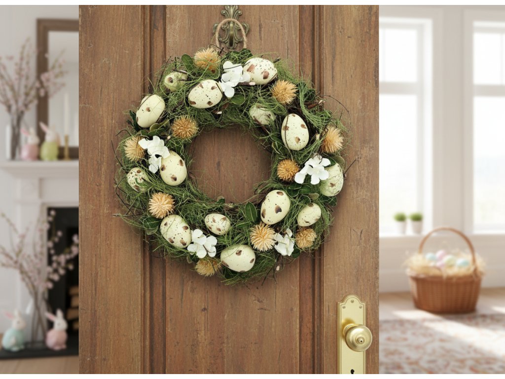 Velikonoční věnec je hustá kompozice suchých větviček, zelených listů a umělé trávy, která vyniká svou dynamickou strukturou. Věnec má průměr 32 cm a byl ozdoben plastovými vajíčky různých velikostí - vypadají velmi realisticky, protože jejich světlé skořápky jsou posety tmavšími skvrnami. Jarní charakter věnce podtrhují bílé květy připomínající květy jabloní a také suché bodláky.