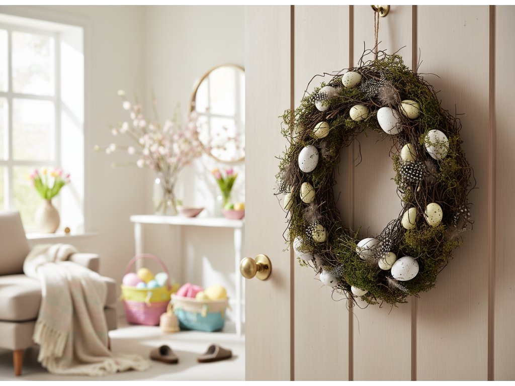 Středový prvek umístěný v obývacím pokoji nebo zavěšený na dveřích vytvoří nádhernou atmosféru plnou přirozenosti a jarní radosti. Lze jej použít jako velikonoční dekoraci do kuchyně, jídelny nebo obývacího pokoje. Skvěle bude vypadat na krásně prostřeném stole během velikonoční snídaně a slavnostní večeře.