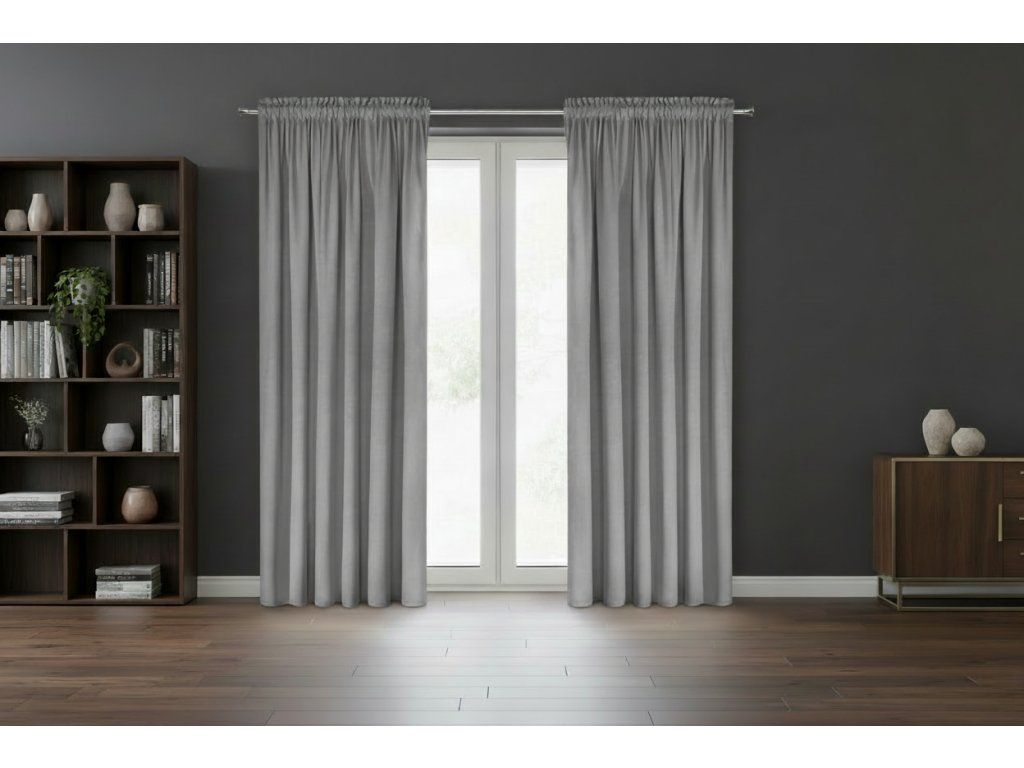 Závěs z z měkké a nadýchané sametové látky s jemným leskem elegantně oživí moderní interiér. Neutrální odstín skvěle doplňuje celkovou výzdobu. Silnější, nadýchaná a dobře zakrývající okno tkanina s hustou vazbou dobře zakrývá okno, zajišťuje soukromí a příjemnou atmosféru v interiéru. Univerzální řasicí páska o šířce 7 cm, všitá v horní části záclony, umožňuje přizpůsobit hustotu řasení, díky čemuž látka po zavěšení na záclonovou tyč vypadá elegantně. Páska má také tunýlek, což dává možnost zavěsit záclonu na tyčovou záclonovou tyč. Záclona s jednoduchým střihem a pečlivým zpracováním se perfektně hodí ke stylu každého interiéru – od klasického přes skandinávský až po glamour.