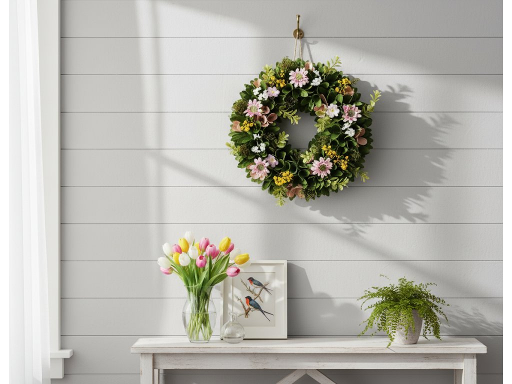 Jemný design v pastelových barvách - Ideální pro zdobení dveří, stěn a velikonočního stolu - Umělý žlutý věnec 34 x 34 x 7,5 cm