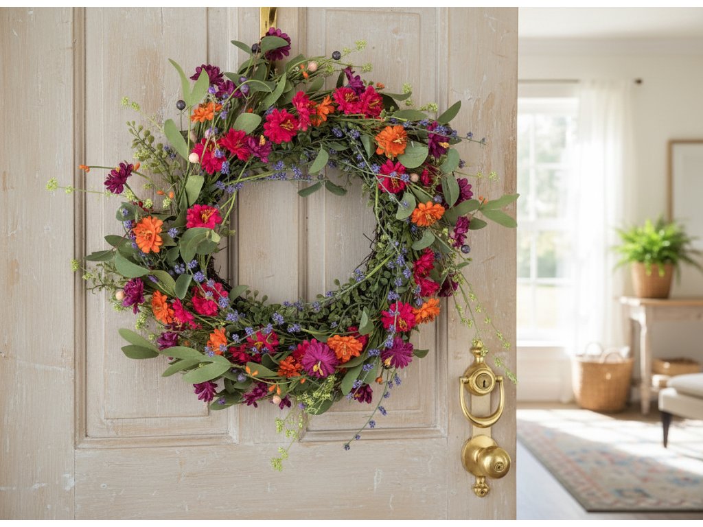 Věnec je ideální jako sezónní dekorace interiéru. Můžete jej zavěsit na zeď, dveře nebo okno, případně jej umístit na stůl či komodu. Skvěle se bude hodit k jarním, letním a velikonočním aranžmá. Barevné květy nádherně oživí prostor, aniž by vyžadovaly zalévání nebo péči.