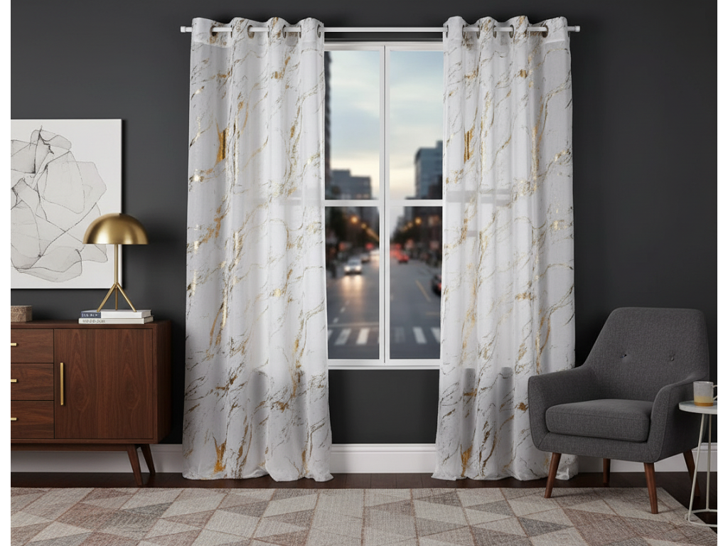 Dekorační vzorovaná záclona s kroužky MARMA bílá zlatý potisk 140x250 cm (cena za 1 kus) MyBestHome