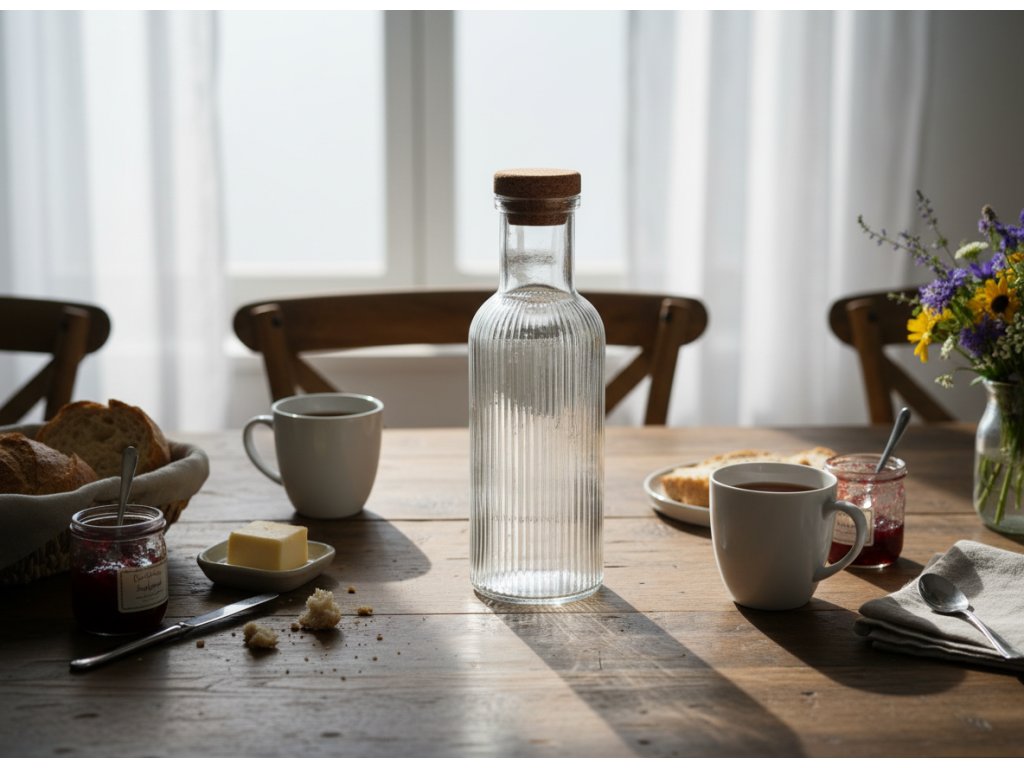 Dodejte svému interiéru eleganci a šarm s krásnou karafou NATIA. Rýhované sklo nejen skvěle vypadá na stole, ale také zajišťuje jistý úchop a pohodlné používání při nalévání nápojů. Přírodní zátka zajišťuje těsnost a chrání obsah, zároveň je krásným doplňkem celku.