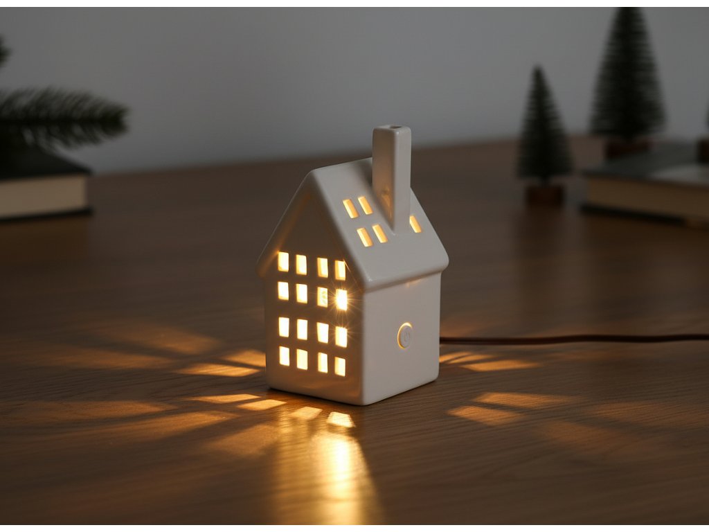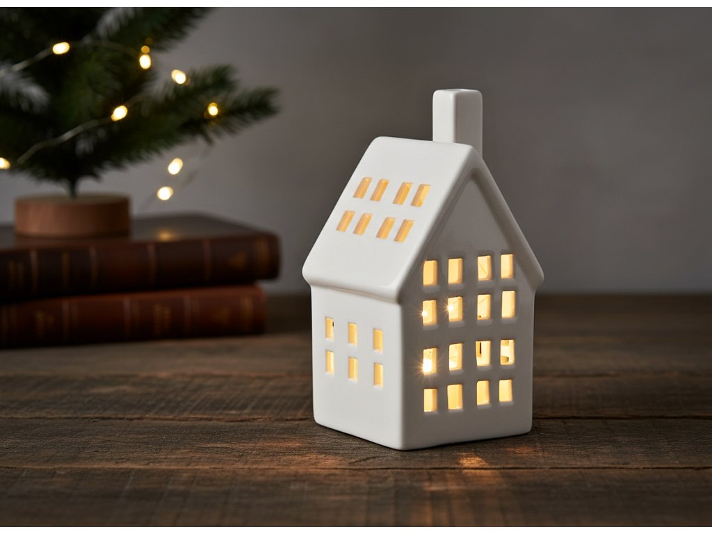 Univerzální dekorace pro každý den i na Vánoce - Atmosférické teplé bílé světlo - Bílá keramika s lesklou povrchovou úpravou - Napájení na baterie - Keramický domeček s bílým LED světlem