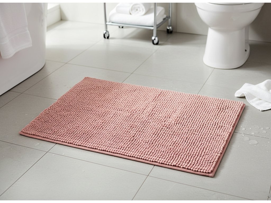 Měkký materiál příjemný na dotek - Chrání podlahu před stříkající vodou - Pečlivě lemované okraje - Rozměry: 50 x 70 cm - Růžový koupelnový kobereček 50 x 70 cm