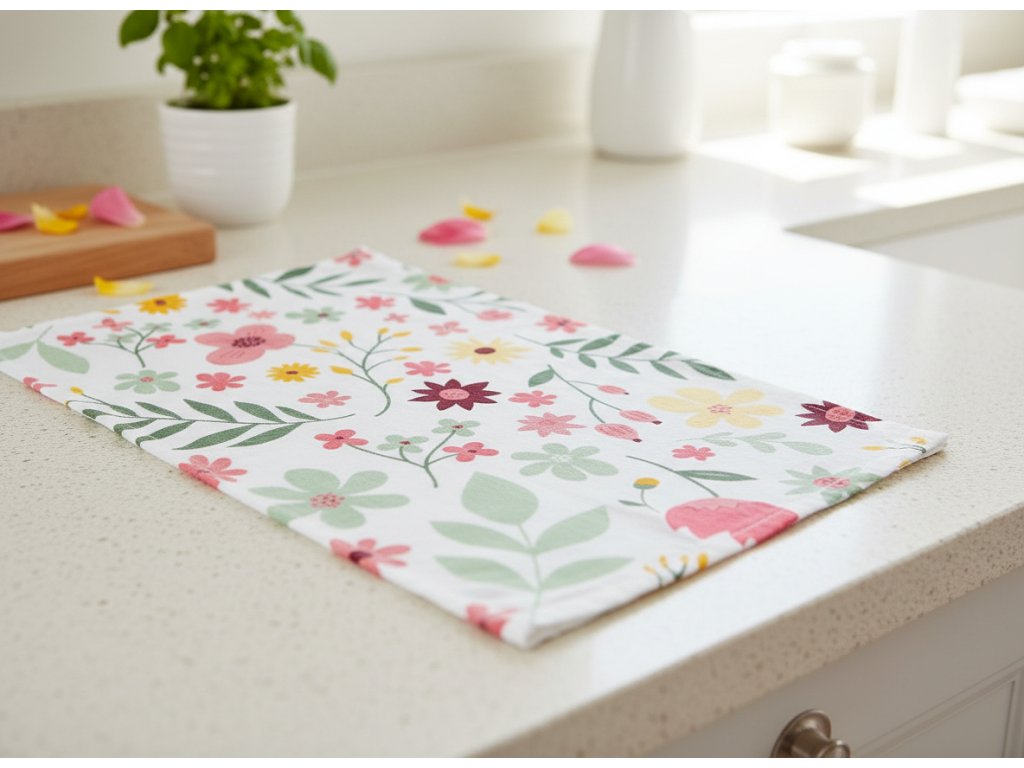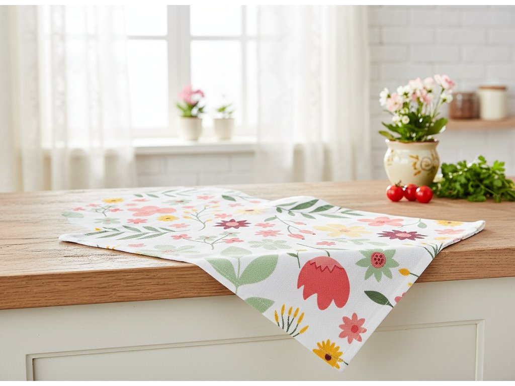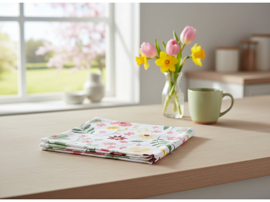 Kuchyňská utěrka ze 100% bavlny s jarním motivem je praktickým pomocníkem i krásným doplňkem, který rozzáří každodenní vaření i pečení.