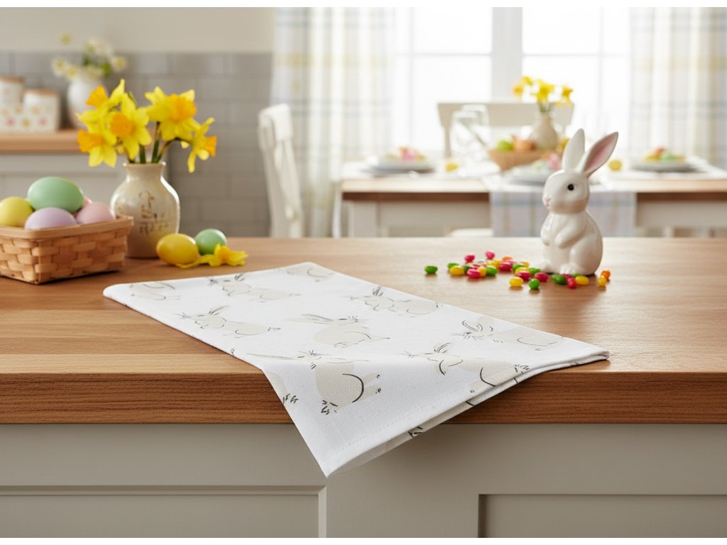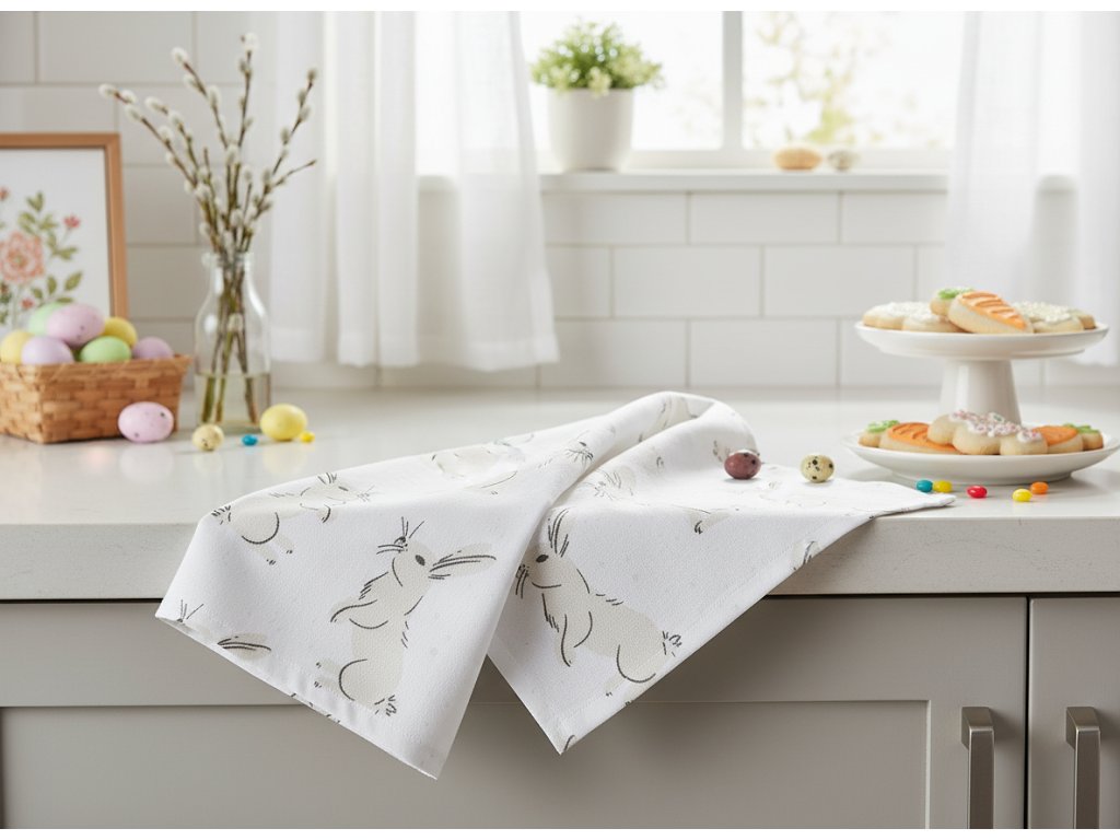 Kuchyňská utěrka ze 100% bavlny s velikonočním motivem je praktickým pomocníkem i krásným doplňkem, který zpříjemní každodenní vaření a pečení během svátků.