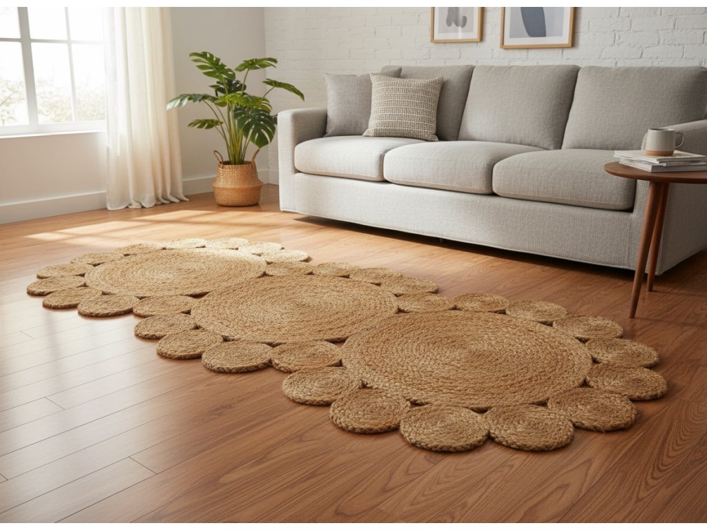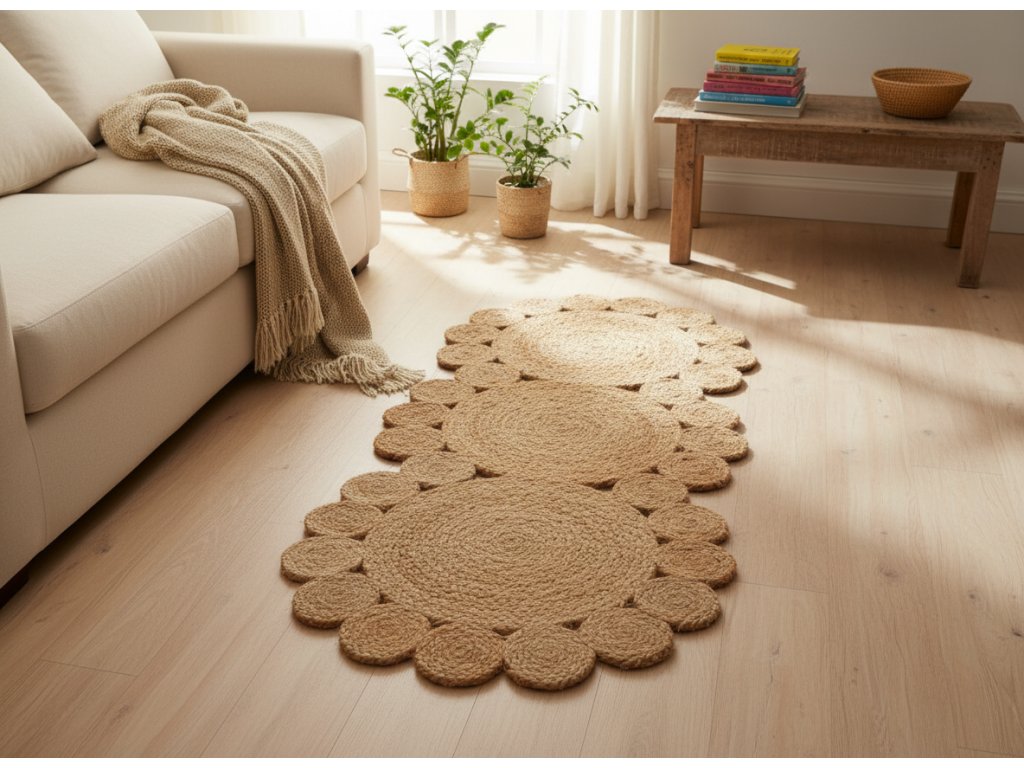 - Juta nebo sisal: Přírodní vlákna, která přidávají texturu a rustikální vzhled.