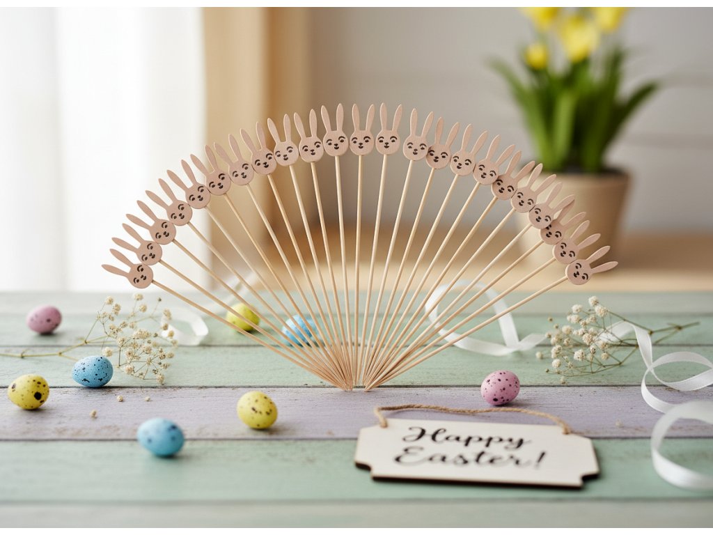 Včetně 20 tyčinek - Každá končí přátelským obličejem zajíčka - Přírodní materiál - Ideální pro zdobení velikonočních dobrot - Velikonoční napichovátka 20 ks.