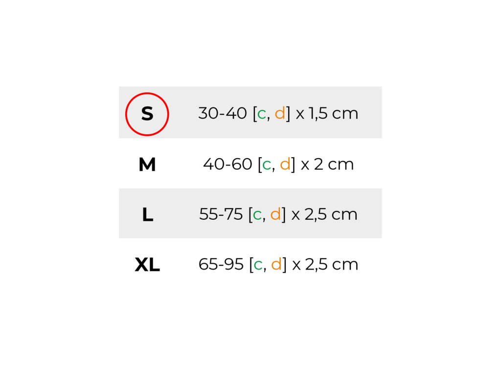 Velikost S : 30-40 [c, d] x 1,5 cm - Velikost M : 40-60 [c, d] x 2,0 cm - Velikost L : 55-75 [c, d] x 2,5 cm - Velikost XL : 65-95 [c, d] x 2,5 cm