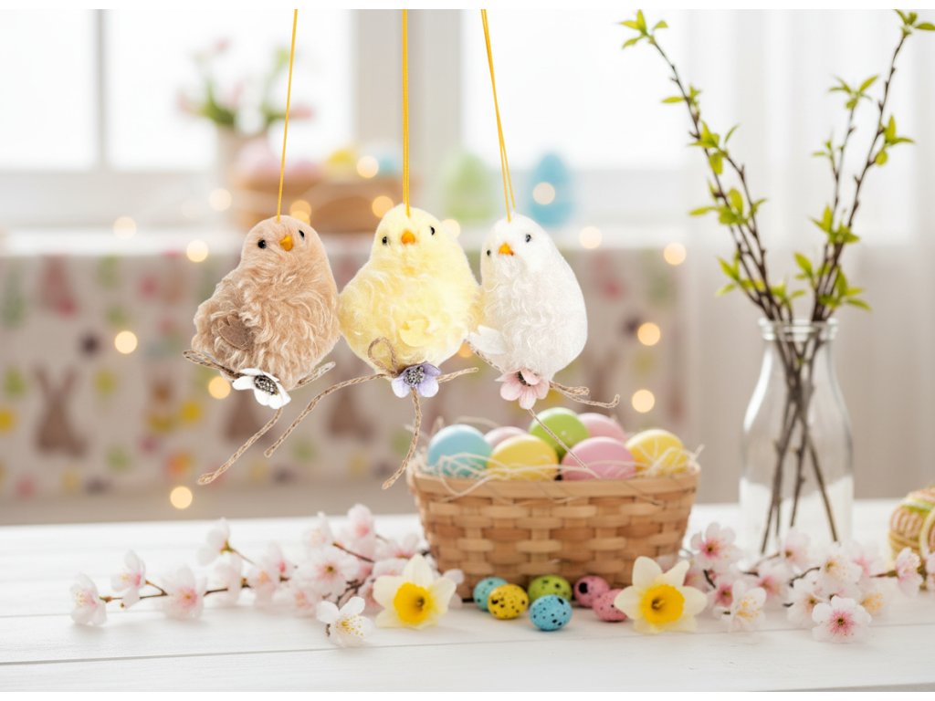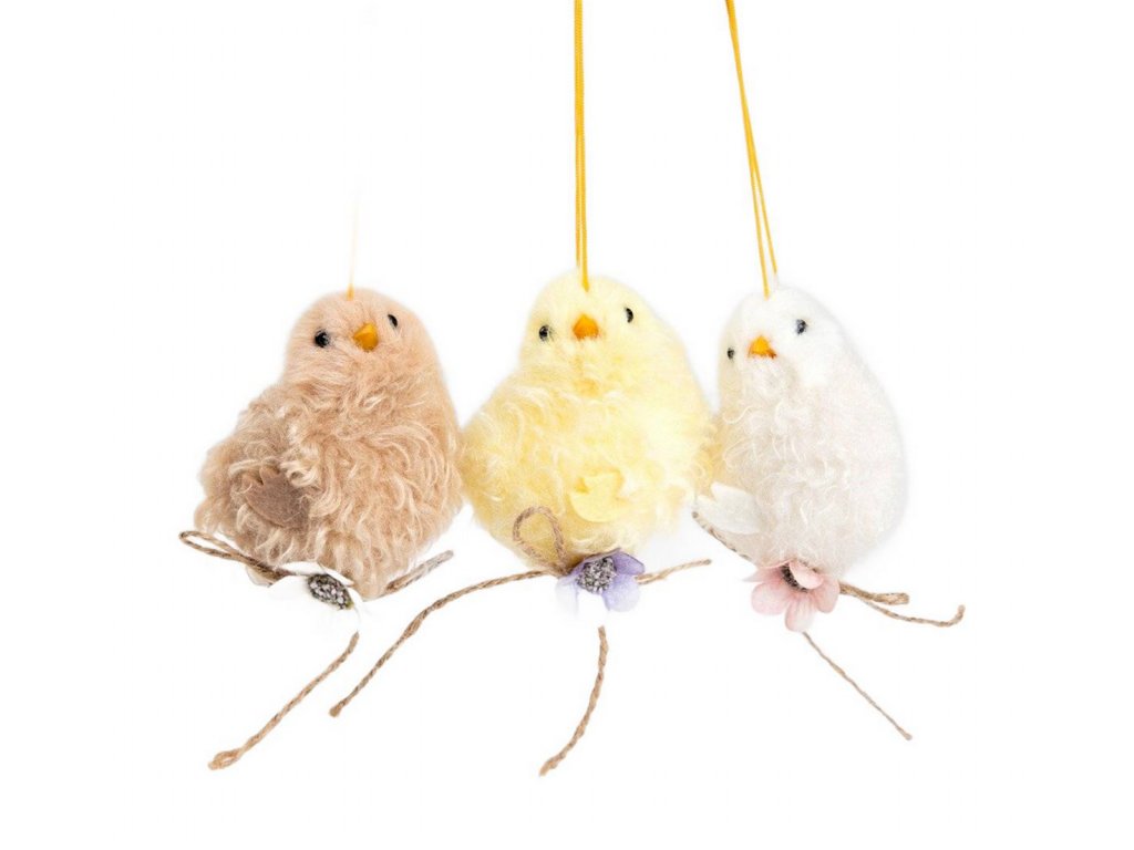 Kuřátka jsou vyrobena z měkkého a odolného materiálu, jsou lehká a snadno se zavěšují.