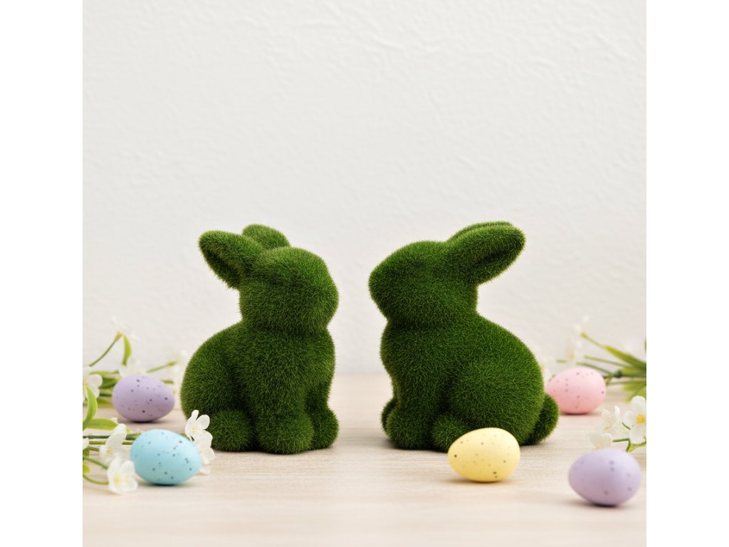 Dekorativní figurky ve tvaru zajíců. - Tlumená zelená barva, kterou lze snadno kombinovat s přírodními a jasnými doplňky. - Malý tvar ideální pro vytváření jemných sezónních dekorací. - Vyrobeno z odolného plastu.