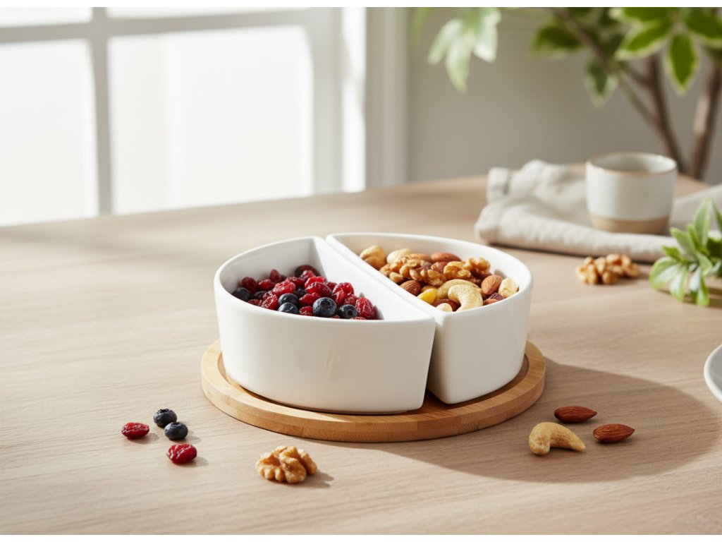 Ideální pro podávání občerstvení, předkrmů a dezertů - Vysoce kvalitní kamenina a bambusové dřevo - Sada 2 misek s podšálkem