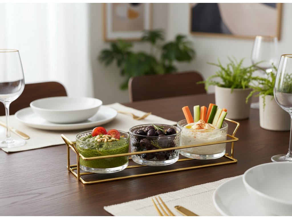 Sada SERENE je skvělou volbou pro každého, komu záleží na krásném způsobu servírování občerstvení na stůl. Sada obsahuje 3 misky a kovový stojan s uchy pro pohodlné přenášení celé sady. Misky jsou vyrobeny z průhledného tepané skla, které dokonale ladí se zlatou barvou stojanu. Celek tvoří mimořádně harmonickou kompozici plnou elegance a stylového minimalismu.