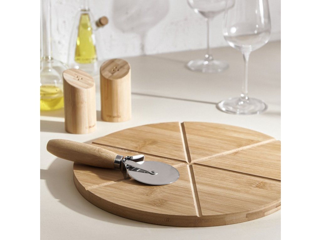 Sada na servírování pizzy BAMBOU je určena především k originálnímu domácímu servírování pizzy. Na bambusovém prkénku, které má jedinečný styl a atmosféru přímo z italských pizzerií, budou skvěle vypadat všechny druhy pizzy. Sada vypadá na stole skvěle a robustnost a kvalita jejího zpracování dodává eleganci nejen podobě podávaných pokrmů, ale také interiéru nejedné jídelny nebo kuchyně.