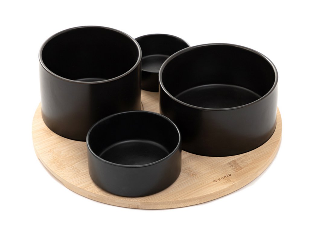 Hledáte jedinečný způsob, jak servírovat hostům občerstvení? Sada servírovacích misek YIFAN vám to umožní. Sada obsahuje 4 misky (každou v jiné velikosti) a bambusové prkénko, které slouží jako stojan. V prkénku jsou zářezy, takže misky zůstávají na jednom místě a nehýbou se ani při přenášení. Černá kamenina vypadá skvěle v kombinaci s přírodním dřevem, takže sada je nejen užitečná, ale také velmi stylová.