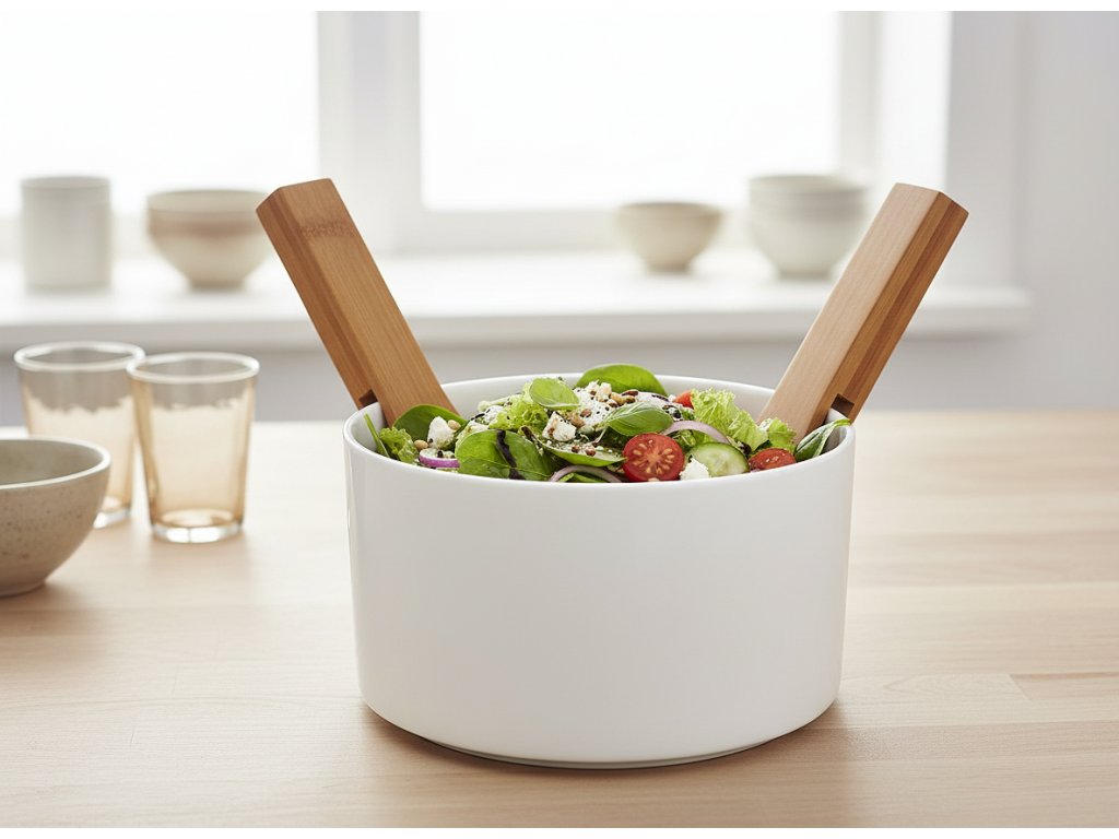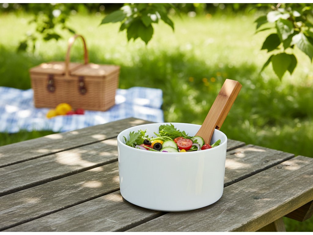 Mísa na salát s bambusovými lžícemi je praktickým nádobím pro každodenní použití i pro zvláštní příležitosti. Je ideální pro servírování během slavnostní večeře nebo setkání s přáteli. Mísa z vysoce kvalitního porcelánu je estetická, odolná, funkční a snadno se udržuje v čistotě. Mísu lze mýt v myčce nádobí, ale lžíce by se měly mýt pouze ručně.