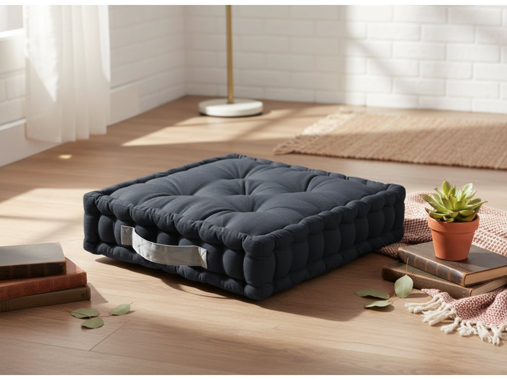Podlahový polštář je ideální a praktický bytový doplněk, který využijete jako další sezení pro hosty, nebo jako sedací polštář pro letní stolování na zahradě nebo terase. Vyrábí se z různých materiálů, jako je bavlna nebo z příměsí juty v trendových barvách a vzorech. Výplň je z recyklovatelné bavlny. Výhodou je, že má na boku praktickou rukojeť na přenášení. Podlahové polštáře jsou vyráběny v různých tvarech, barvách, designech a velikostech.