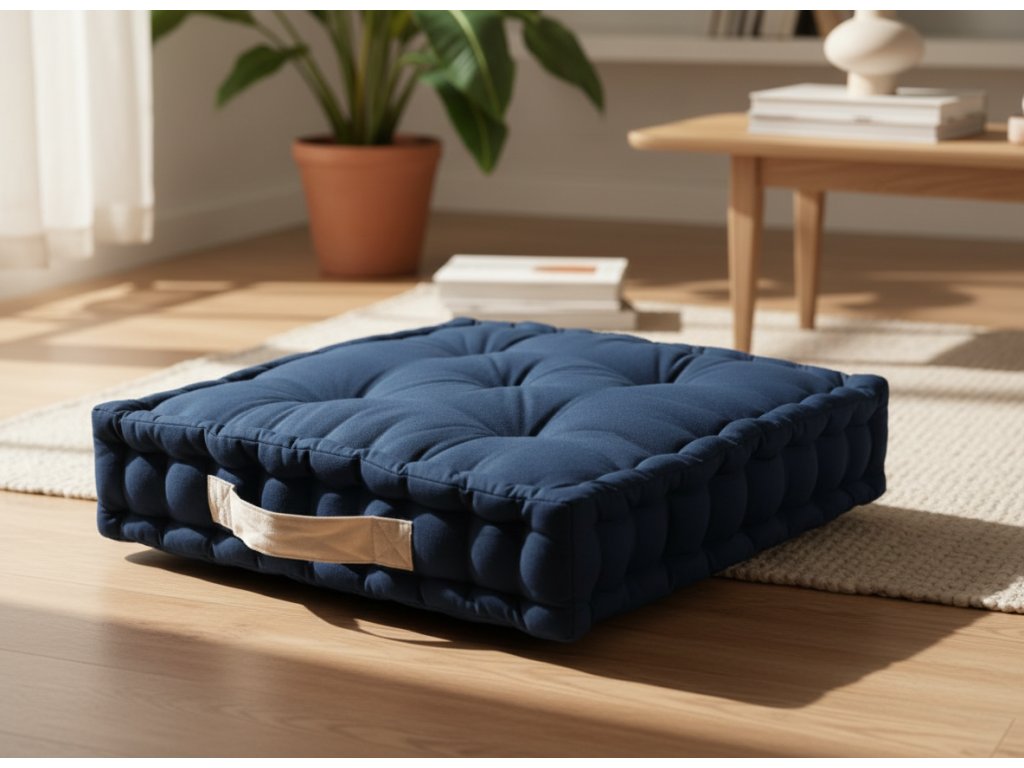 Podlahový polštář je ideální a praktický bytový doplněk, který využijete jako další sezení pro hosty, nebo jako sedací polštář pro letní stolování na zahradě nebo terase. Vyrábí se z různých materiálů, jako je bavlna nebo z příměsí juty v trendových barvách a vzorech. Výplň je z recyklovatelné bavlny. Výhodou je, že má na boku praktickou rukojeť na přenášení. Podlahové polštáře jsou vyráběny v různých tvarech, barvách, designech a velikostech.