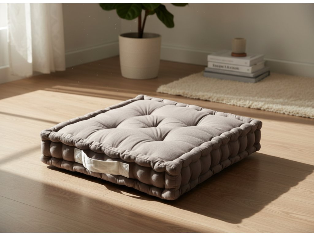 Podlahový polštář je ideální a praktický bytový doplněk, který využijete jako další sezení pro hosty, nebo jako sedací polštář pro letní stolování na zahradě nebo terase. Vyrábí se z různých materiálů, jako je bavlna nebo z příměsí juty v trendových barvách a vzorech. Výplň je z recyklovatelné bavlny. Výhodou je, že má na boku praktickou rukojeť na přenášení. Podlahové polštáře jsou vyráběny v různých tvarech, barvách, designech a velikostech.
