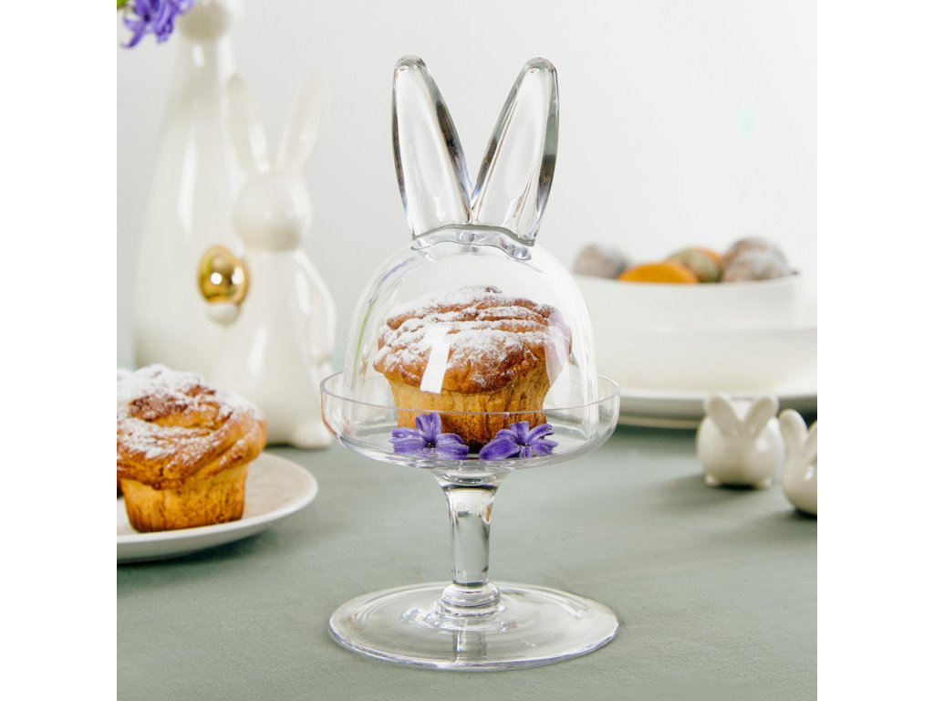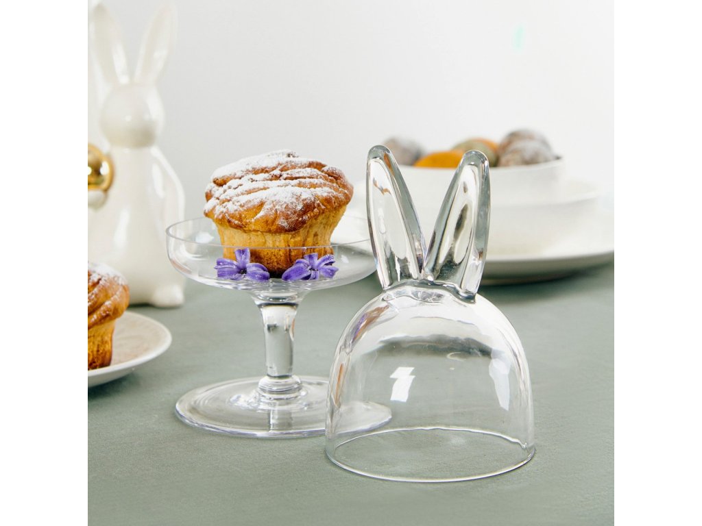 Talíř PRATA je elegantní mísa na zdobené nožce. Má zvýšené okraje, které zabraňují sklouznutí koláčů a občerstvení při přenášení na stůl. Skleněný talíř je celý vyroben z průhledného skla, takže je univerzálním doplňkem každého stolu. Velikonoční charakter podtrhuje skleněné víko ve tvaru kopule, které je zakončeno zaječími oušky. Chrání koláče před vysycháním a na volném prostranství také před hmyzem. Právě víko samo o sobě esteticky evokuje Vánoce - bez něj lze talíř používat po celý rok! Rozměry: 12x23 cm.