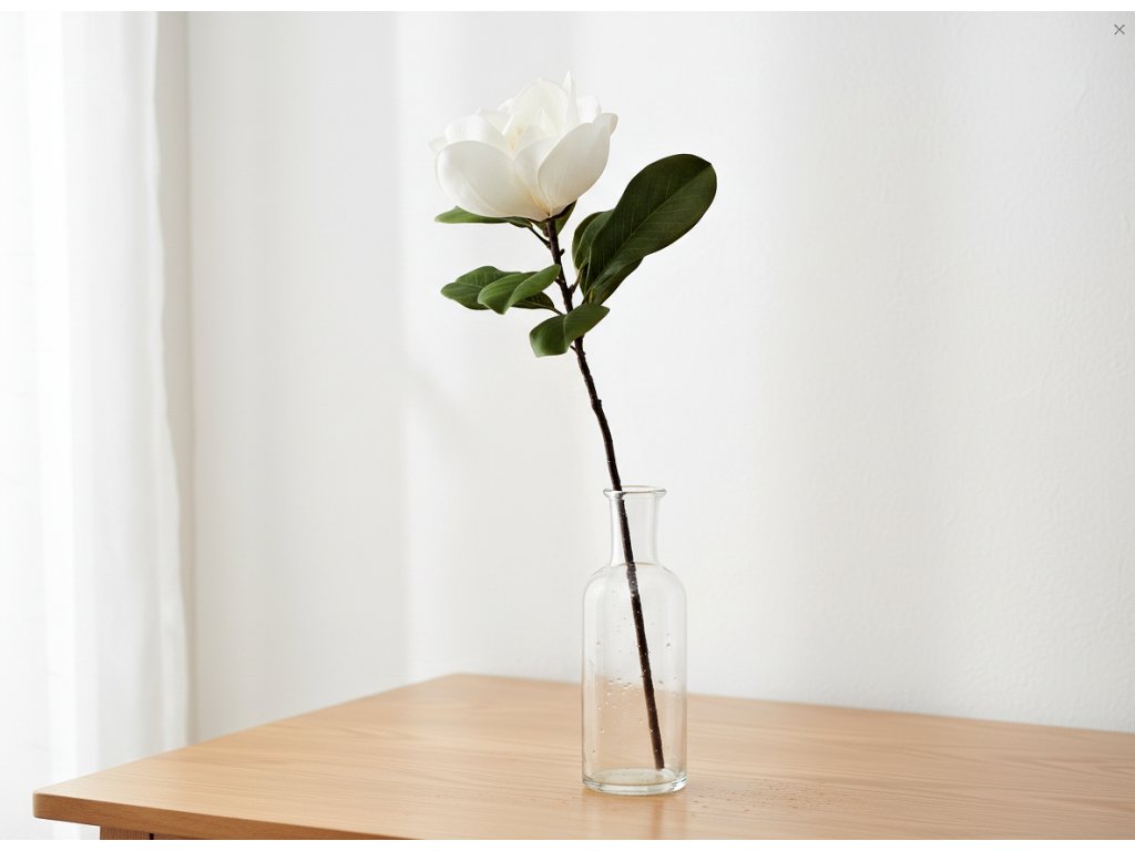 Umělá magnólie se vyznačuje realistickým tvarem. Byla vyrobena s důrazem na detail, jako je nerovnost větve, síť žilek v listech nebo nepravidelné okvětní lístky květu. Podlouhlý květ se vyznačuje čistě bílou barvou, takže se hodí do většiny aranžmá.