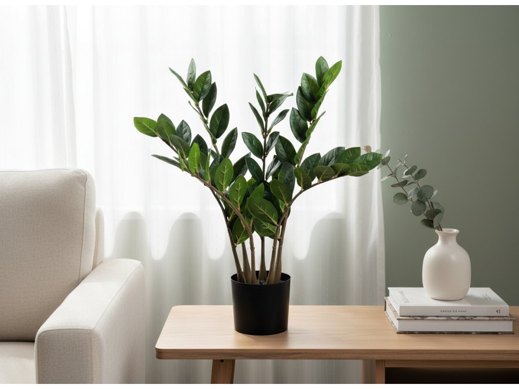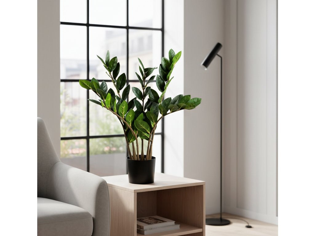 Zamioculcas je jednou z nejcennějších pokojových rostlin a umělá verze zaujme svým realistickým vzhledem. Sytě zelené listy a přirozeně vypadající stonky se perfektně hodí do jakékoli aranžmá a dodávají mu svěžest a harmonii. Díky své kompaktní výšce 45 cm je zamiokulkas ideální na komody, parapety nebo stoly. Je vynikající volbou pro prostory, kde by přírodní rostliny měly potíže s růstem.