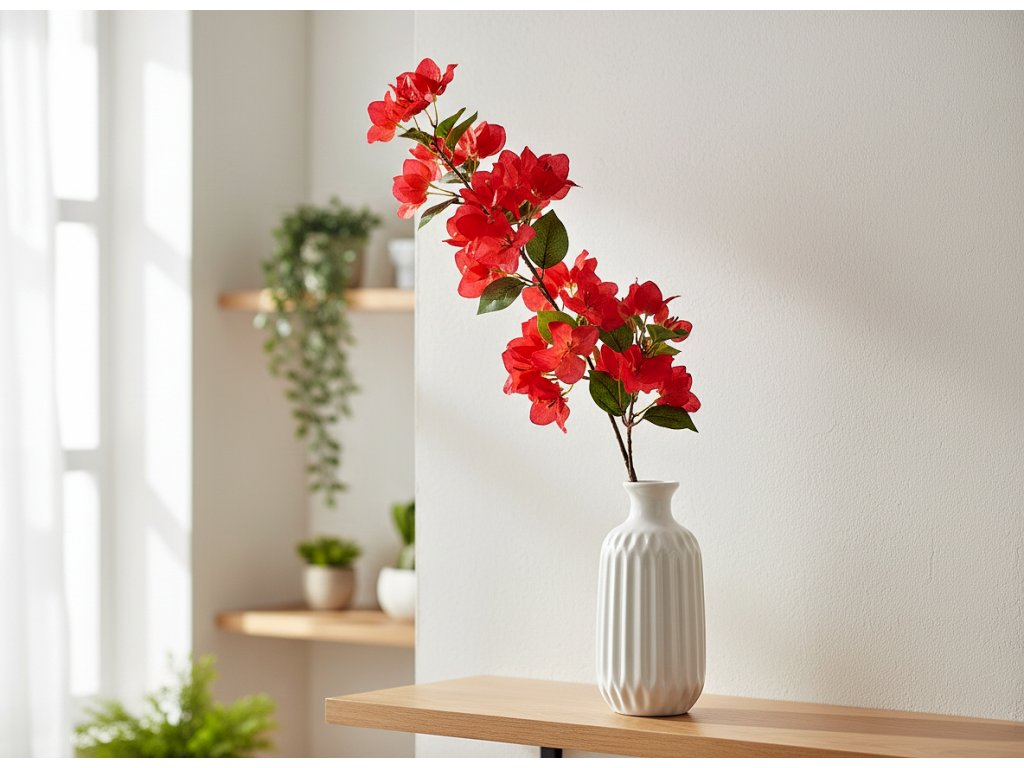 Větvička je ideální do vysokých váz, květinových kompozic, na dekorace při různých akcích a na focení. Skvěle poslouží také jako dekorace do obývacího pokoje, ložnice nebo kanceláře. Bude vynikající jako samostatný akcent nebo jako součást větší kytice. Je vyrobena z odolného plastu a věrně napodobuje vzhled skutečné bougainvilley. Materiály jsou odolné proti deformaci, snadno se čistí a zaručeně vydrží dlouhou dobu.