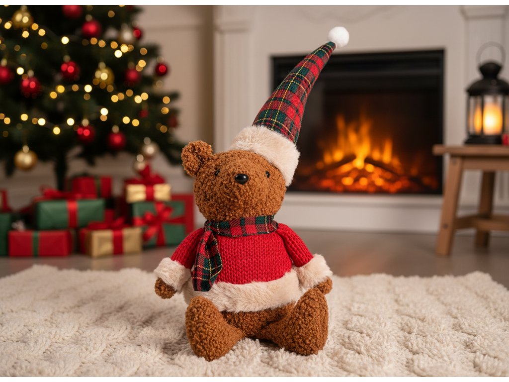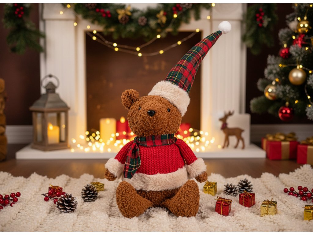 Oblečený v pleteném svetru s ovčí kůží - Čepice a šála se skotským kostkovaným vzorem - Vyrobeno z plyšového materiálu - Ideální jako dárek - Vánoční figurka v kostkovaném svetru