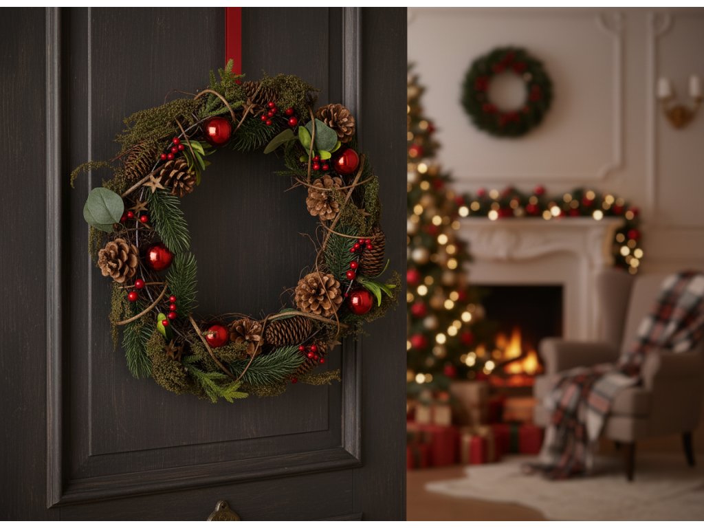 Ideální jako dekorace na dveře, zeď, krbovou římsu nebo stůl. - Zdobeno přírodními šiškami a červenými kuličkami. - V klasických barvách zelené a červené. - Vyrobeno z odolného ratanu a plastu.