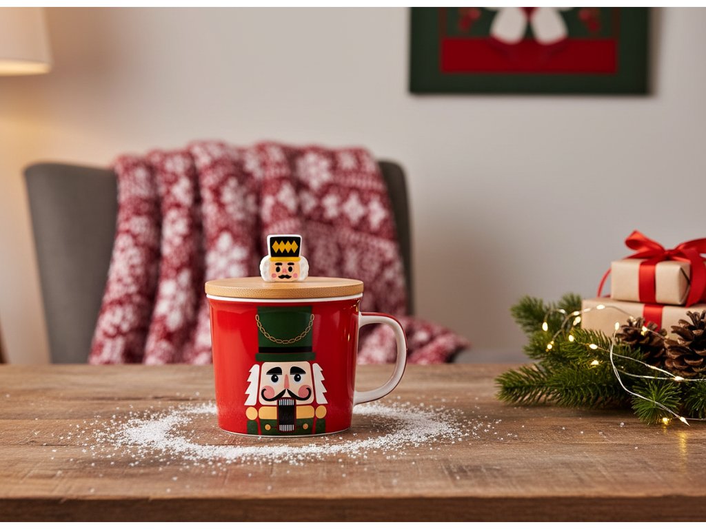 Hrnek s víčkem - Vánoční motiv louskáčka - Porcelánový hrnek s bambusovým víčkem 340 ml