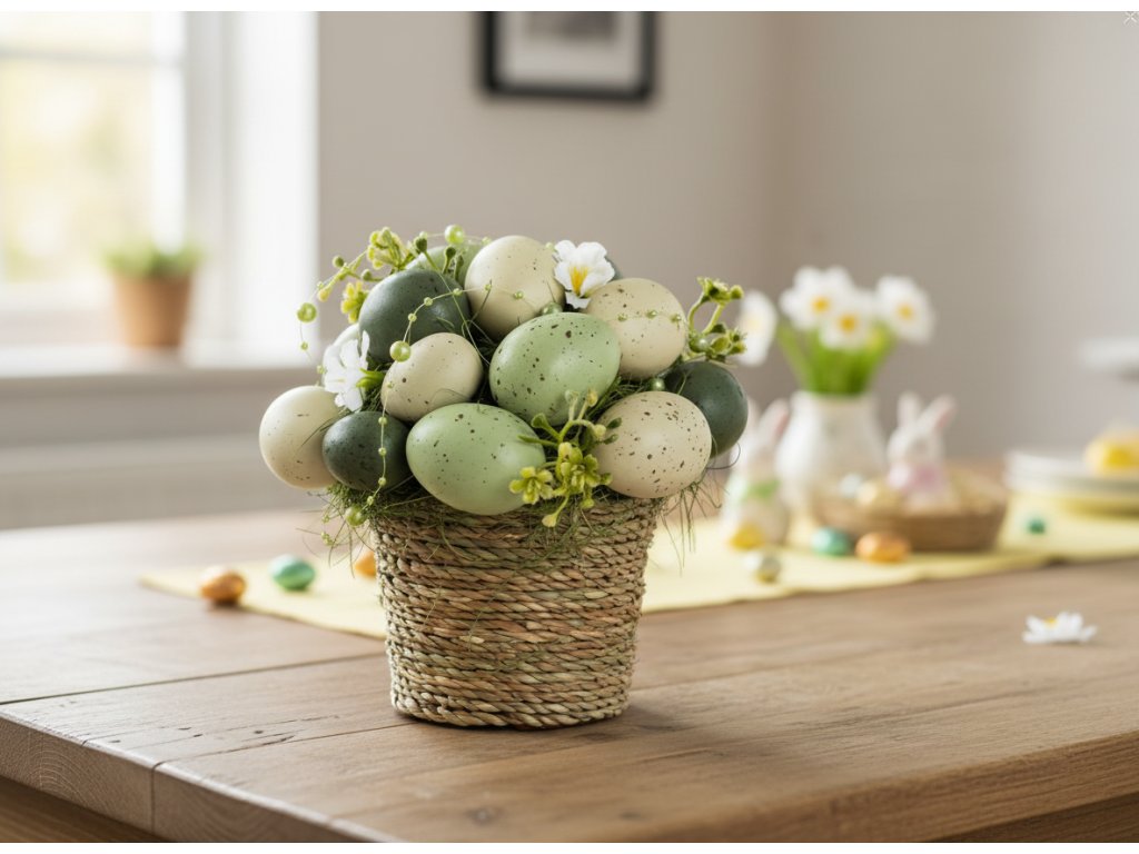 Středová dekorace se bude skvěle hodit na velikonoční stůl, komodu nebo okenní parapet. Skvěle se bude hodit jako samostatná dekorace nebo jako součást větší slavnostní kompozice, která podtrhne zvláštní charakter Velikonoc. Středník je vyroben z odolných materiálů a vyznačuje se precizností a estetikou.