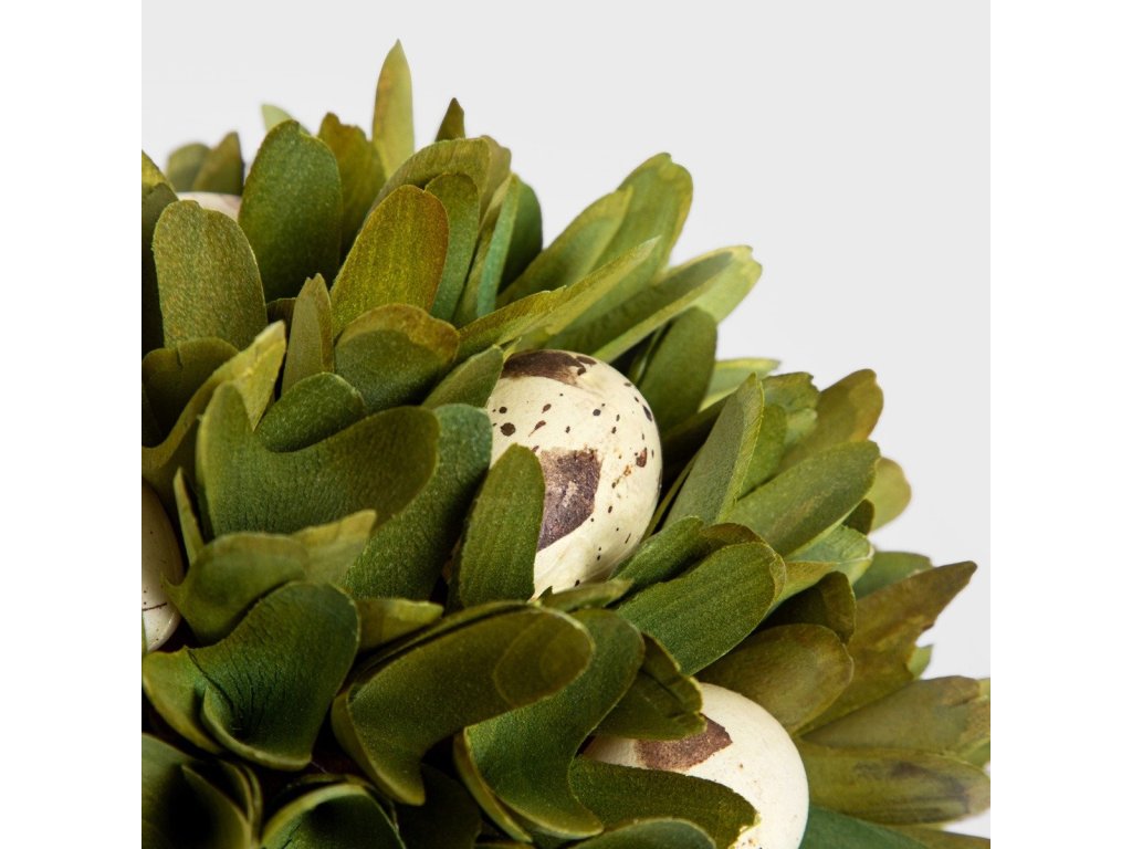 Velikonoční rákos je kompozice z hustých listů složených do praskající kulaté kytice. Rákos má rozměry 20x22 cm a je ozdoben několika plastovými vajíčky - vypadají velmi realisticky, protože jejich světlé skořápky jsou posety tmavšími skvrnami. Umělé listy rákosu připomínají tvrdé listy zimostrázu, takže se budou hodit do vašich velikonočních aranžmá. Boky středového dílu zdobí tmavé větvičky.
