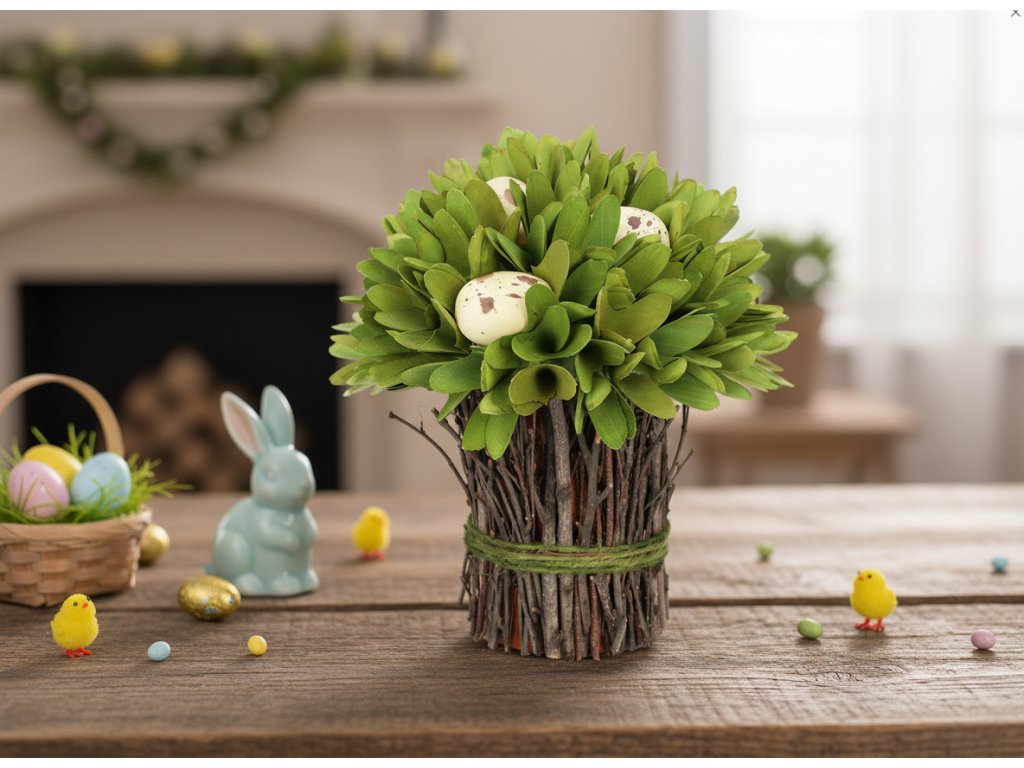 Středový prvek je vyroben z odolného a trvanlivého plastu. Některé součásti jsou vyrobeny z přírodního dřeva. Průměr podstavce: Průměr podstavce: 7 cm - Výška podstavce: 7 cm: 12 cm - 8 dekorativních vajec
