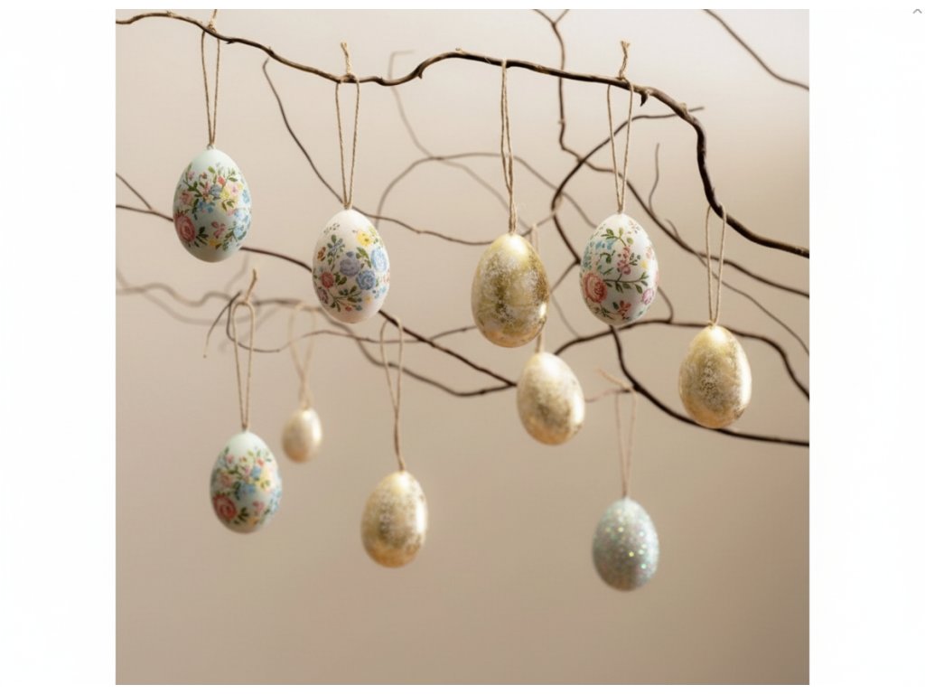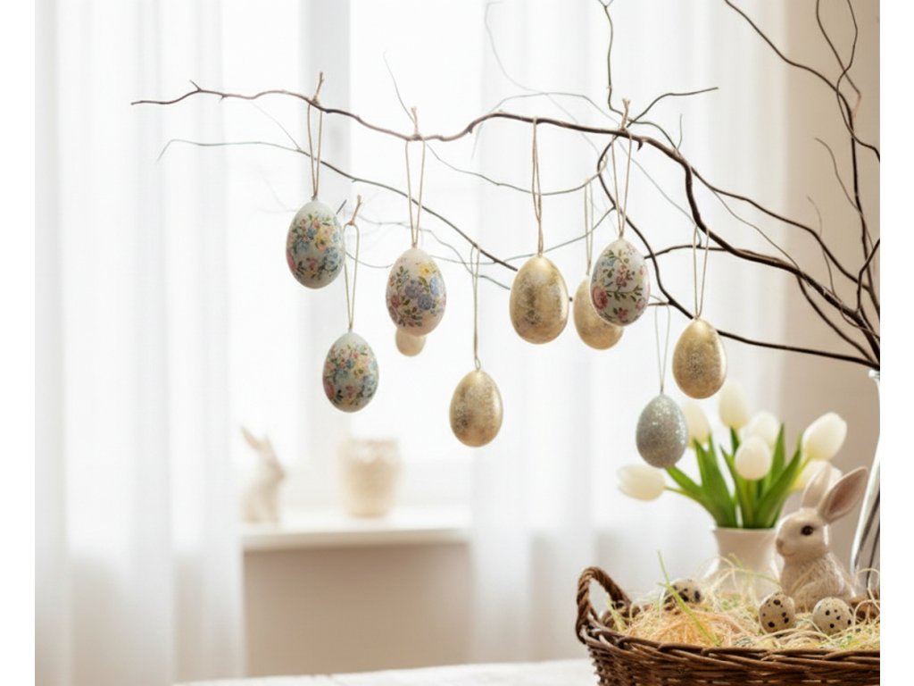 Klasická bílá vajíčka jsou doplněna zlatými prvky, které připomínají přírodní skvrny na povrchu skořápky. Sada obsahuje 8 přívěsků ve tvaru vajíček - každý z nich má jutovou šňůrku, takže je můžete zavěsit na kliky, květiny a větvičky zimostrázu.