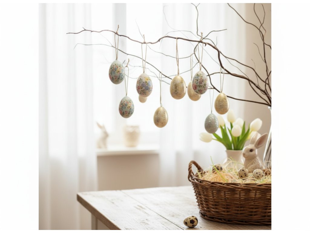 Bílé a zlaté přívěsky na vajíčka je jedinečná sada, která vám umožní připravit jakýkoli interiér na Velikonoce. Sada obsahuje 8 kusů dekorativních přívěsků, které vám pomohou dotvořit nejen aranžmá vašeho domova, ale také kompozici velikonočního ubrusu nebo svátečního košíku.