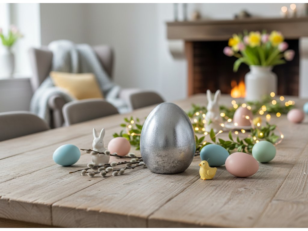 Dekorace ve tvaru vejce je stylový dekorativní prvek, který dokonale podtrhne velikonoční výzdobu interiéru. Stříbrná barva jí dodává eleganci a moderní charakter, díky čemuž se skvěle hodí jak k klasickým, tak k moderním dekoracím. Jednoduchý tvar figurky působí subtilně a zároveň přitahuje pozornost.