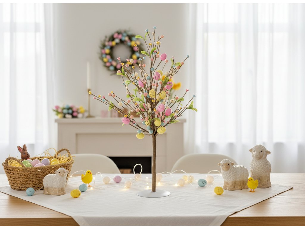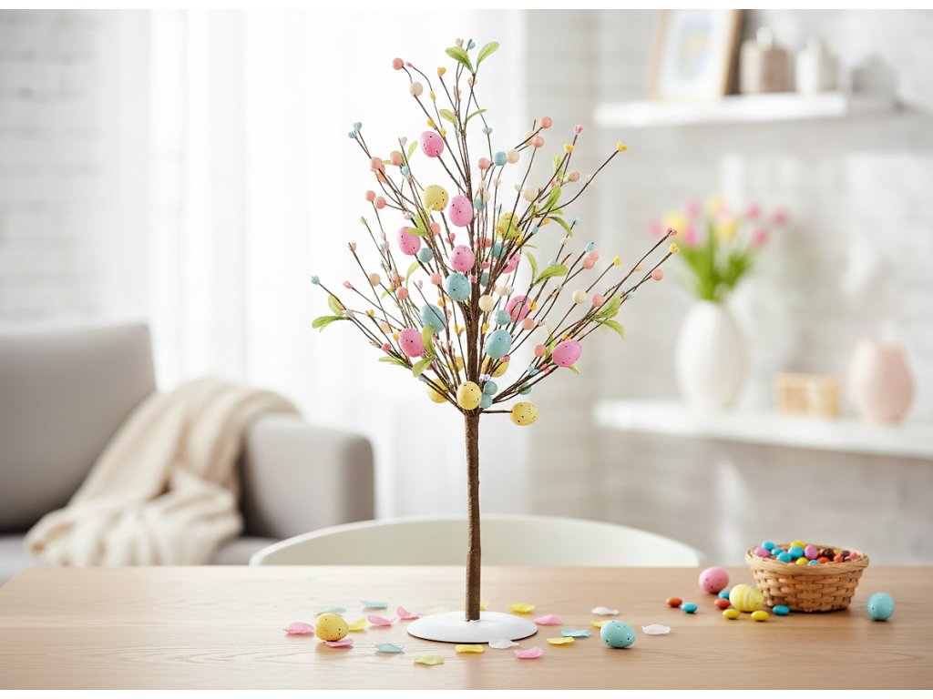 Dekorace má tvar stromu, jehož větve jsou ozdobeny různobarevnými vajíčky v pastelových odstínech - včetně světle modré, jemně růžové, vybělené žluté. Aby celek vypadal více jako strom, jsou větve ozdobeny malými světlými lístky. Středová část o výšce 60 cm dodá výrazný akcent každému velikonočnímu aranžmá. Je usazen na stabilním podstavci.