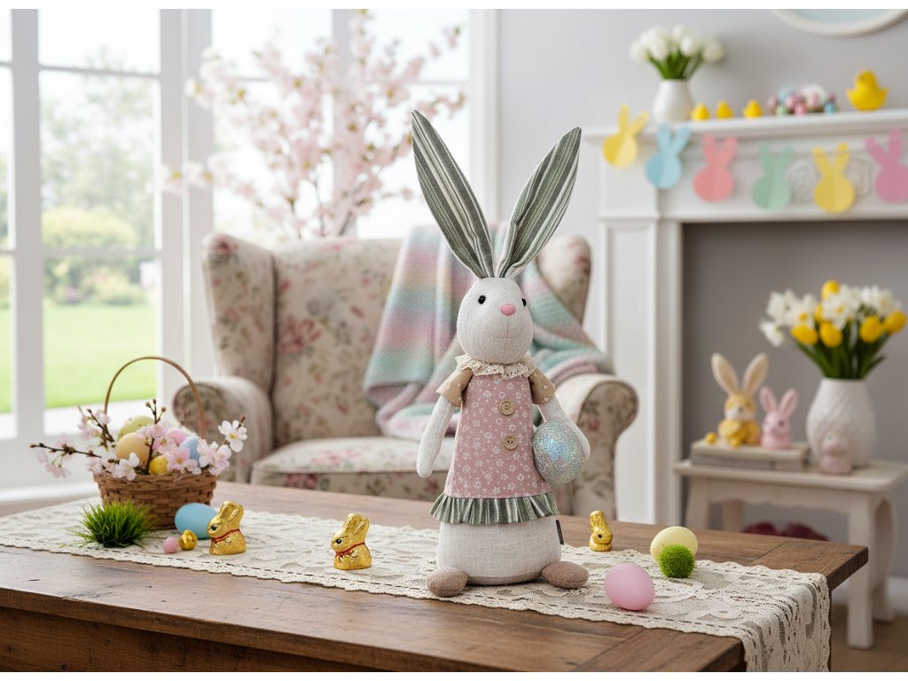Pečlivě vyrobený - Tvarované uši - Krásně barevné oblečení - 3D oči a nos - Stabilní díky vnitřní hmotnosti - Vysoce kvalitní tkanina - Velikonoční zajíček v látce