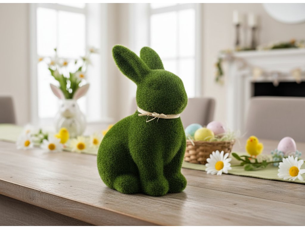 Velikonoční figurka má tvar jednoho ze symbolů Velikonoc - zajíce. Malá dekorace se zaobleným baňatým tvarem znázorňuje sedícího zajíce, zatímco umělý zelený mech napodobuje strukturu jeho fukaru. Výrazná barevnost dekorace je nápadná - srst je osvěžující zelené barvy, která se bude dobře hodit k pastelově zbarveným aranžmá a čerstvým květinám. Jemným dekorativním prvkem je stuha kolem králíkova krku. Rozměry: 16x12 cm.