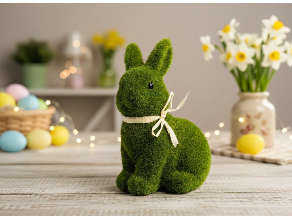 Figurka je jedinečná dekorace, která vnese do vašeho interiéru jarní svěžest a jemné kouzlo. Její povrch připomínající mech a jemná mašle z ní dělají ideální volbu na sváteční stůl nebo komodu.